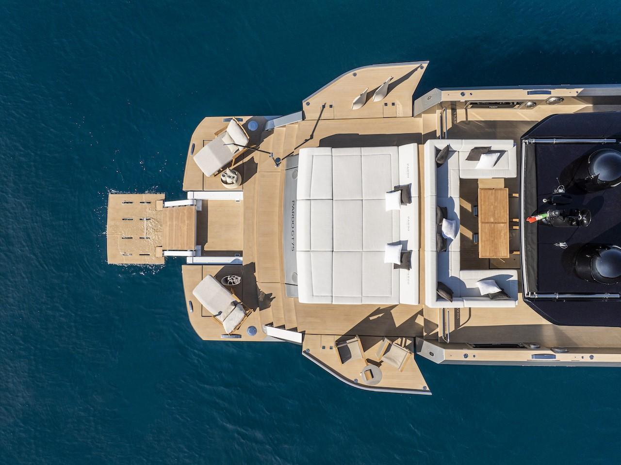 Le GT75 sera construit en deux versions différentes, que nous appelons la version "tender garage" avec de nombreuses possibilités de salon et de rangement et la version "beach" avec une grande terrasse située à l'arrière.