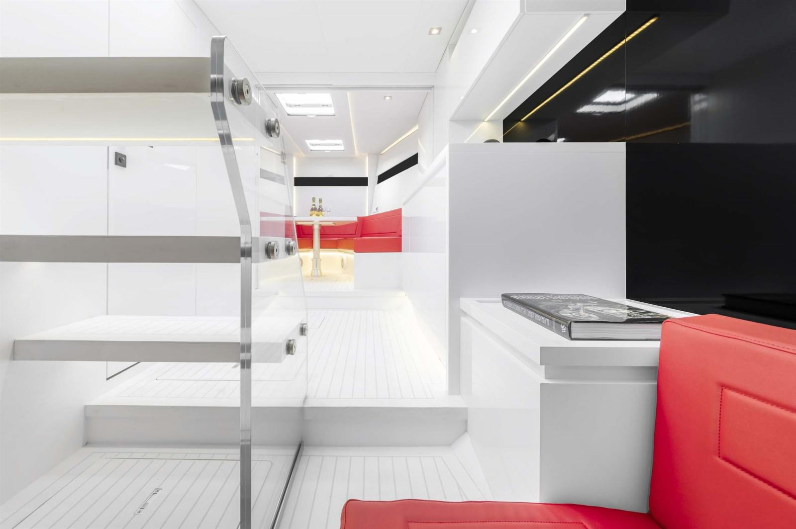 Les espaces intérieurs ont été conçus dans l'intention de créer un design en plein air avec un sens du luxe contemporain. Le blanc apporte une touche d'élégance supplémentaire pour évoquer un sentiment d'harmonie, grâce aux lignes nettes et raffinées du mobilier. Avec le VanDutch 48, les invités navigueront en haute mer en se sentant toujours chez eux.