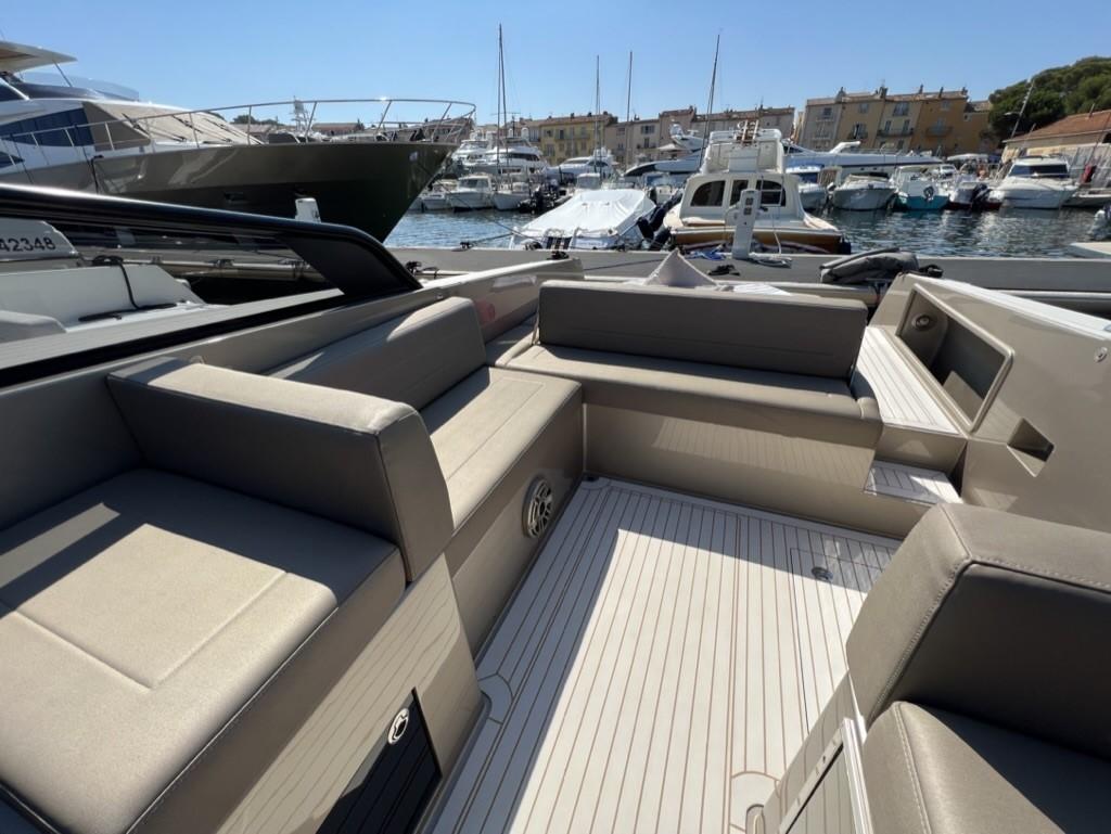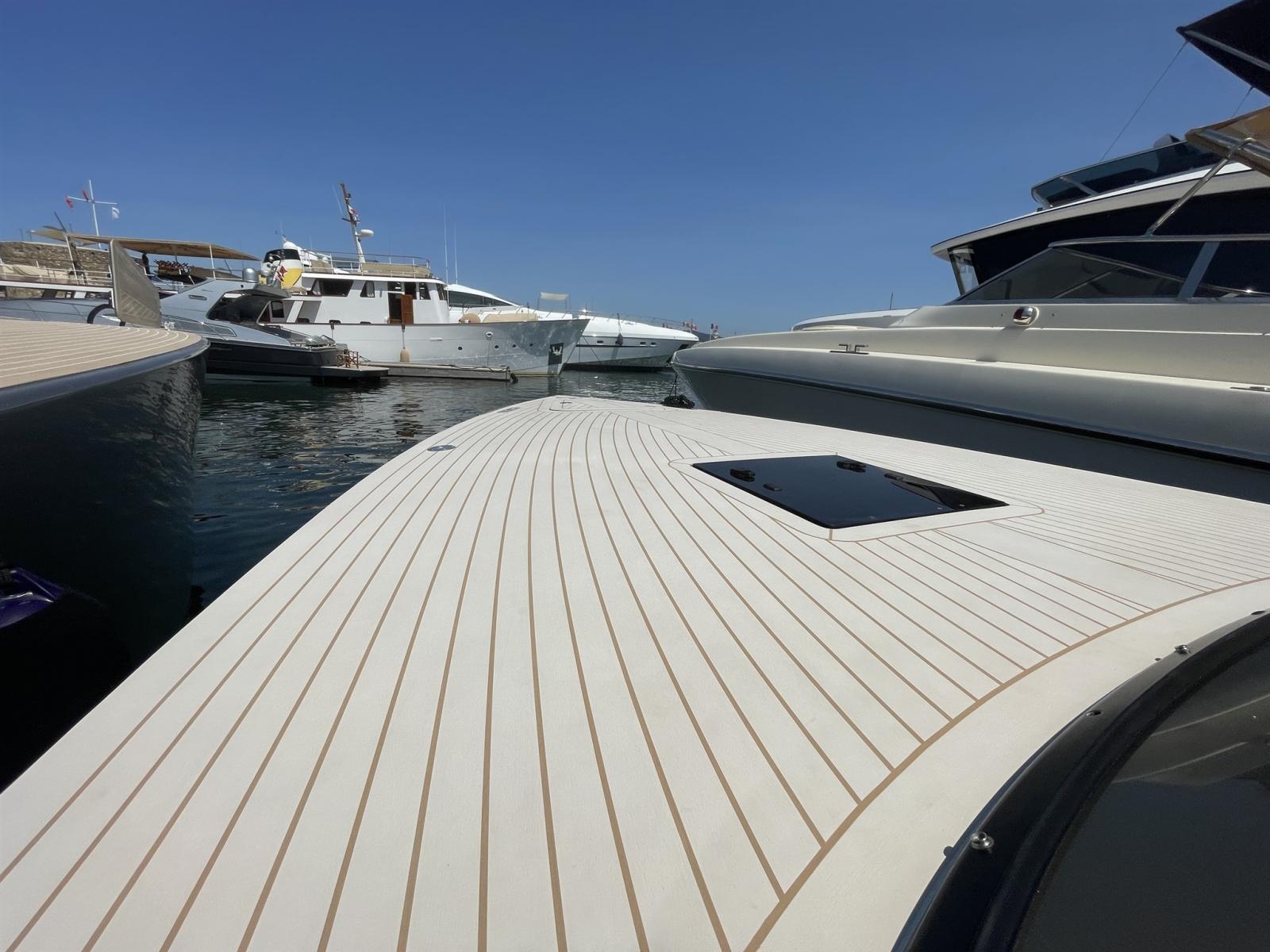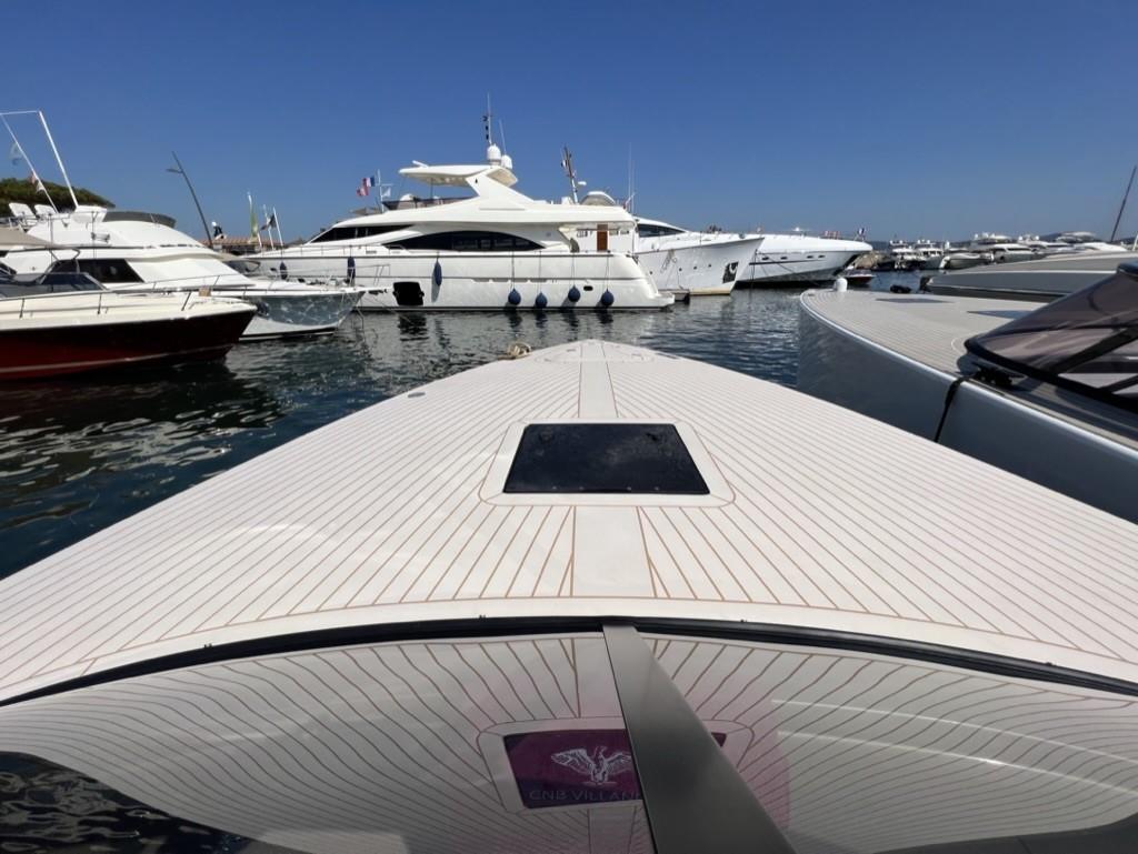 Alternateur, Trim hydraulique, 3 Batteries, Taquets pliants, Système de vidange, Câble d’alimentation à quai, Lavabo dans le cockpit, Spots sous-marins, Moniteur de batterie, Plateforme arrière, Pont en teck, Cockpit en teck, Prise de quai, Guindeau électrique, Echelle de bain, Corne.