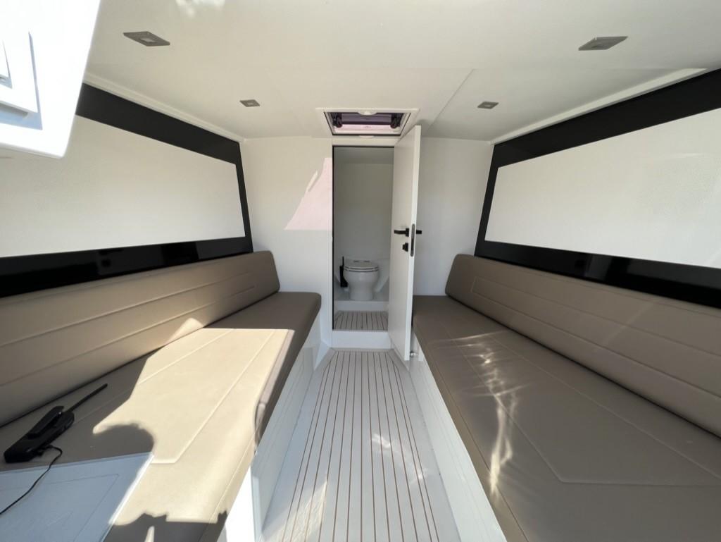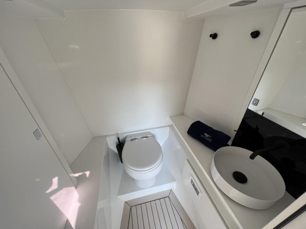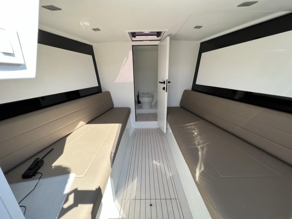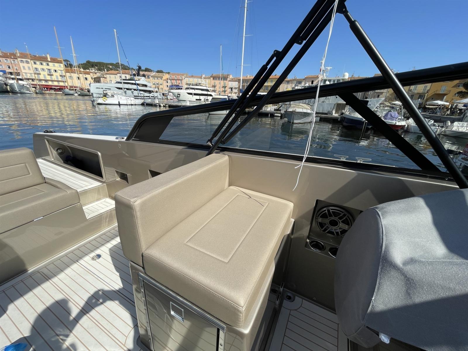 Alternateur, Trim hydraulique, 3 Batteries, Taquets pliants, Système de vidange, Câble d’alimentation à quai, Lavabo dans le cockpit, Spots sous-marins, Moniteur de batterie, Plateforme arrière, Pont en teck, Cockpit en teck, Prise de quai, Guindeau électrique, Echelle de bain, Corne.