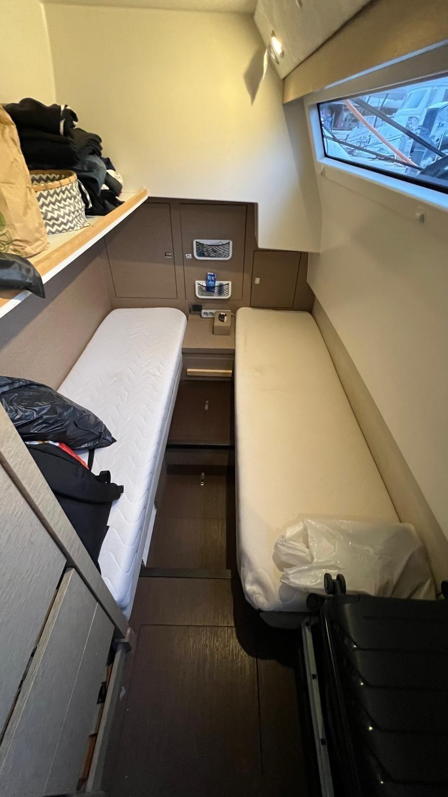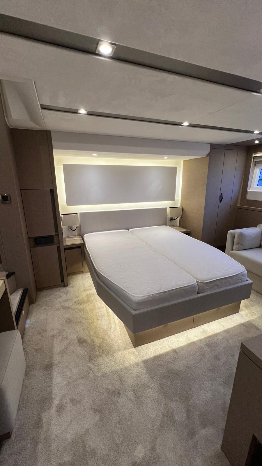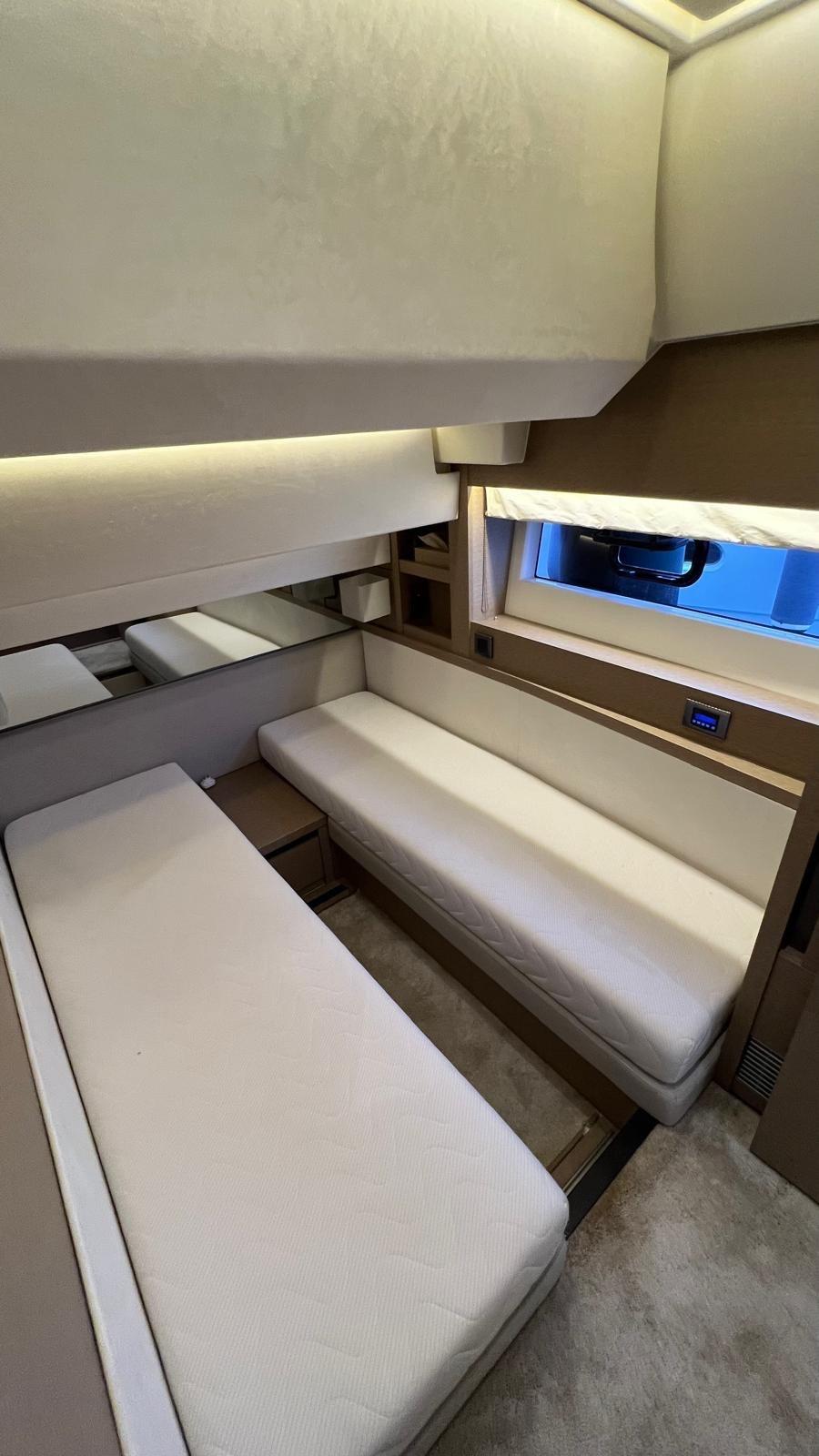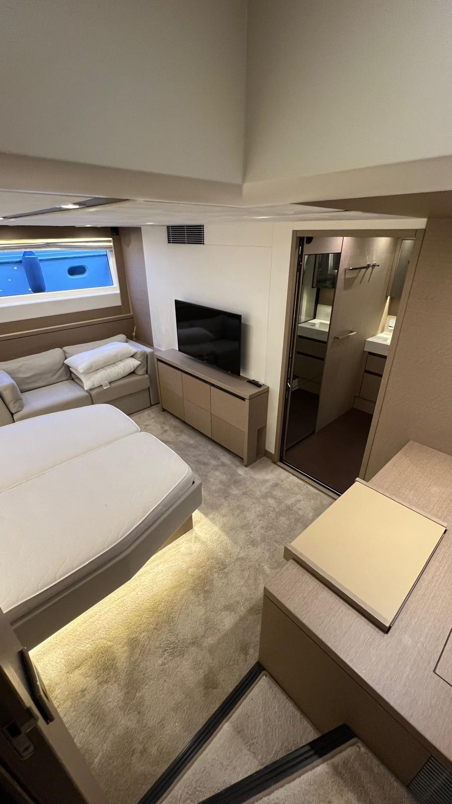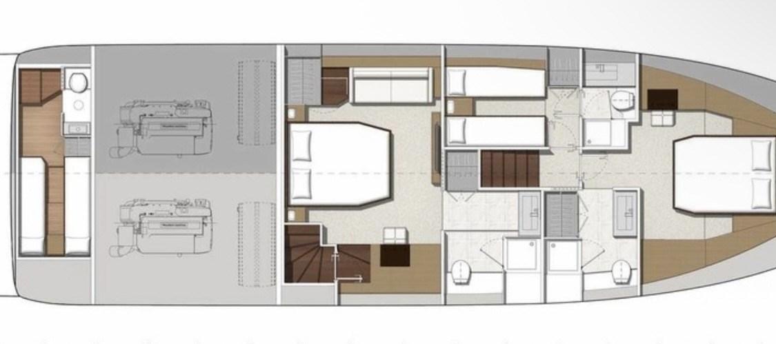 Le Prestige 630S dispose d’une vaste configuration à trois cabines, ainsi qu’une cabine d’équipage à l’arrière, accessible depuis la plateforme de baignade.