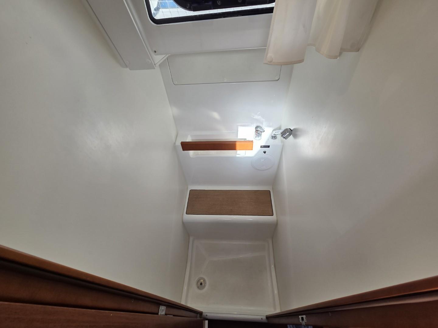 La plage de bain arrière est équipée d’une échelle de bain escamotable descendant au ras de l’eau, facilitant l’accès à la mer, ainsi que d’une douche de cockpit avec mitigeur eau chaude / eau froide.