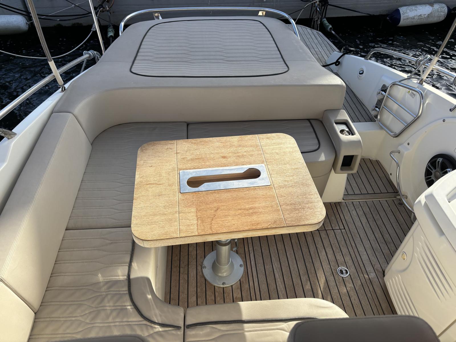 Le cockpit spacieux propose un grand carré convivial avec table amovible, parfait pour les déjeuners en mer. Les larges bains de soleil à l'avant et à l'arrière permettent de profiter pleinement des journées en mer.