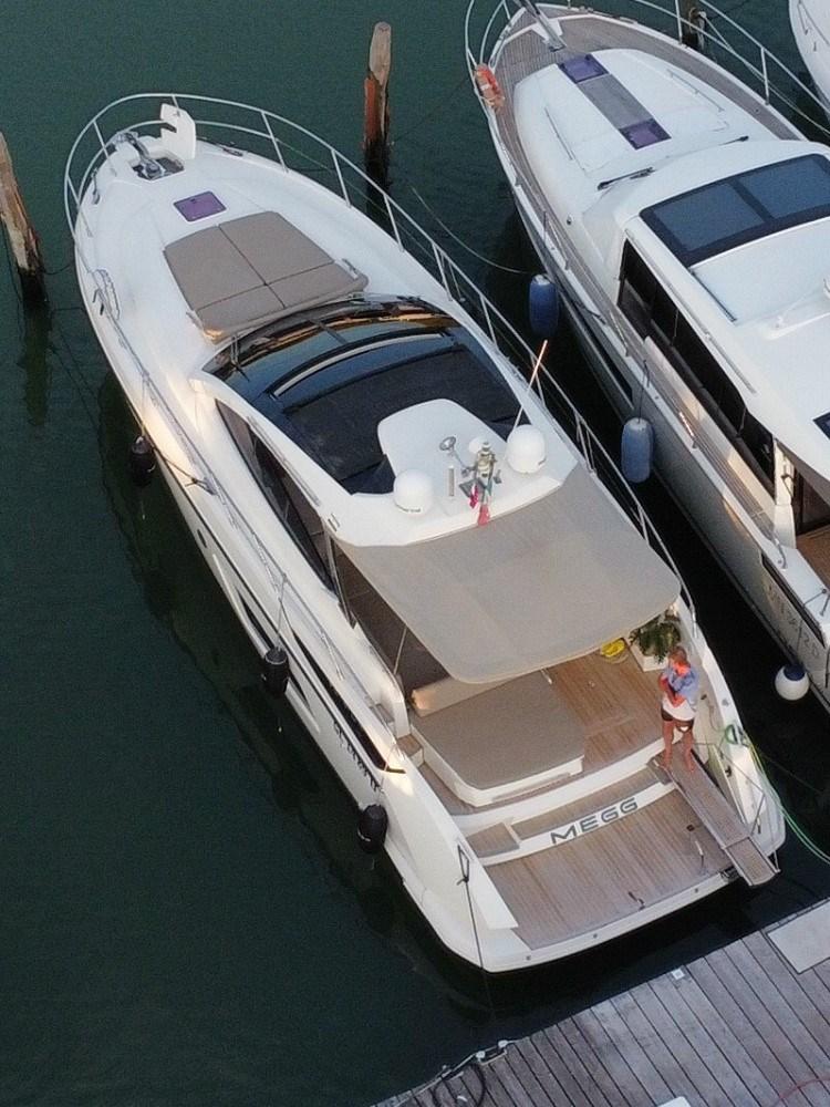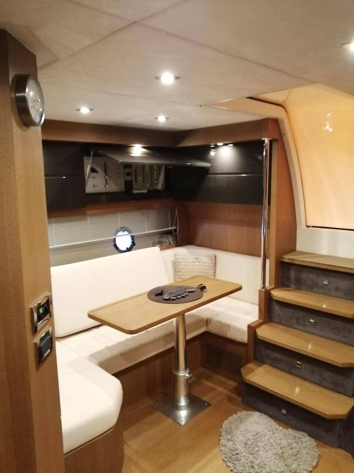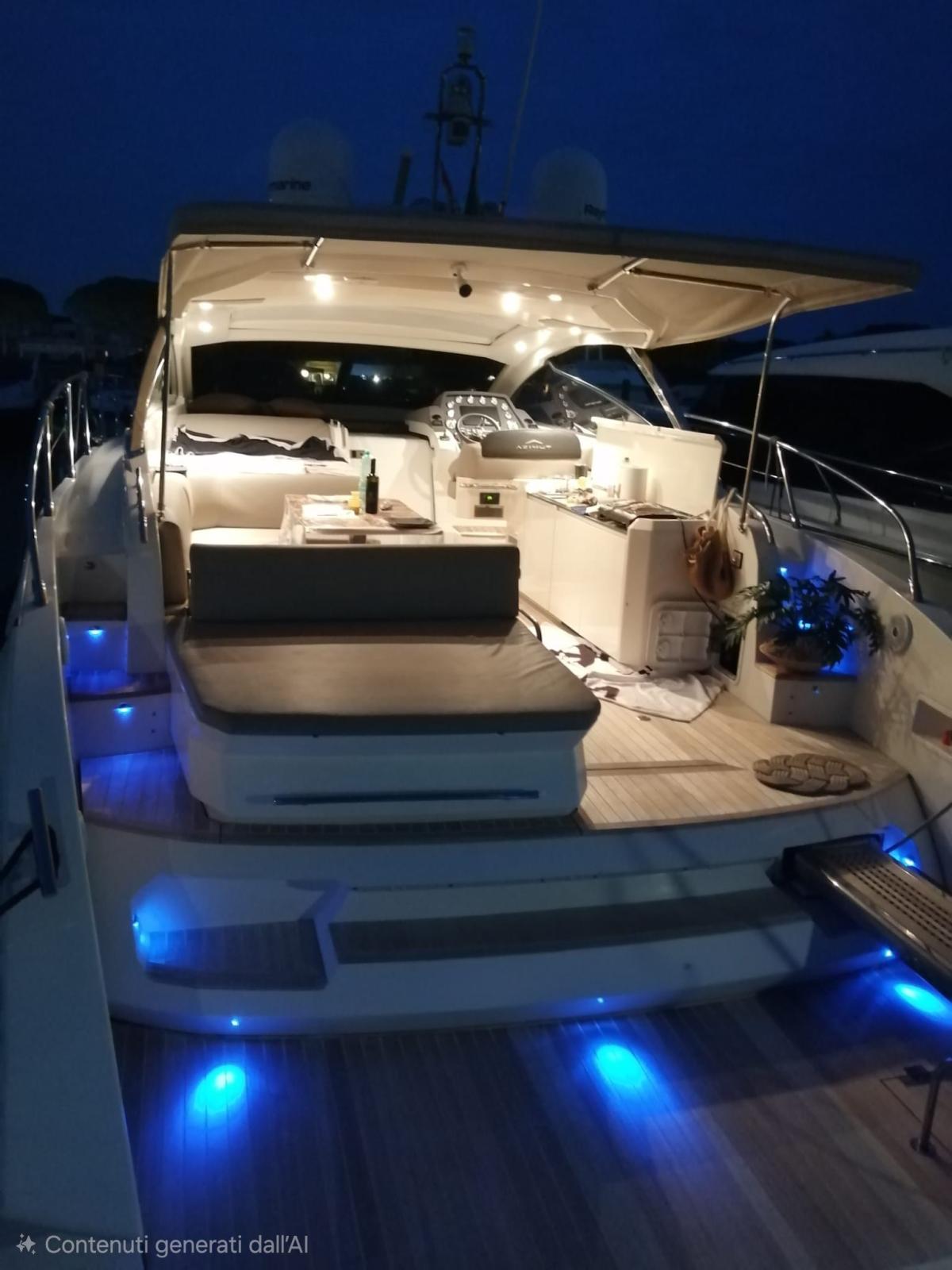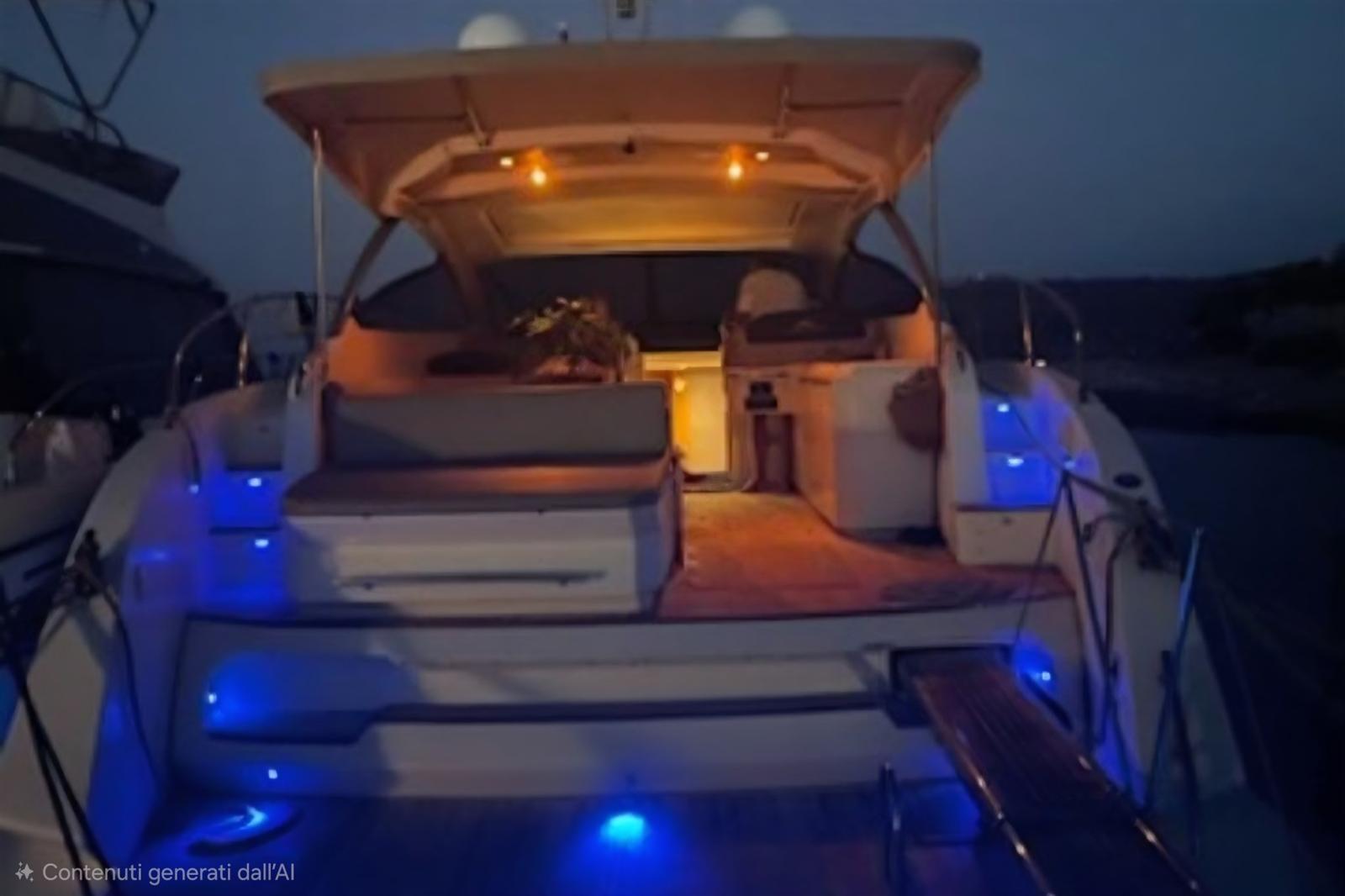Alarme moteur, Alarme de pompe de cale, Eau sous pression, Douche de cockpit, Hard top, Lavabo dans le cockpit, Spots sous-marins, Moniteur de batterie, Passerelle (IDRAULICA A SCOMPARSA), Pompe de cale automatique, Cockpit en teck, Prise de quai, Connexion eau sous pression à quai, Guindeau électrique, Echelle de bain, table de cockpit.