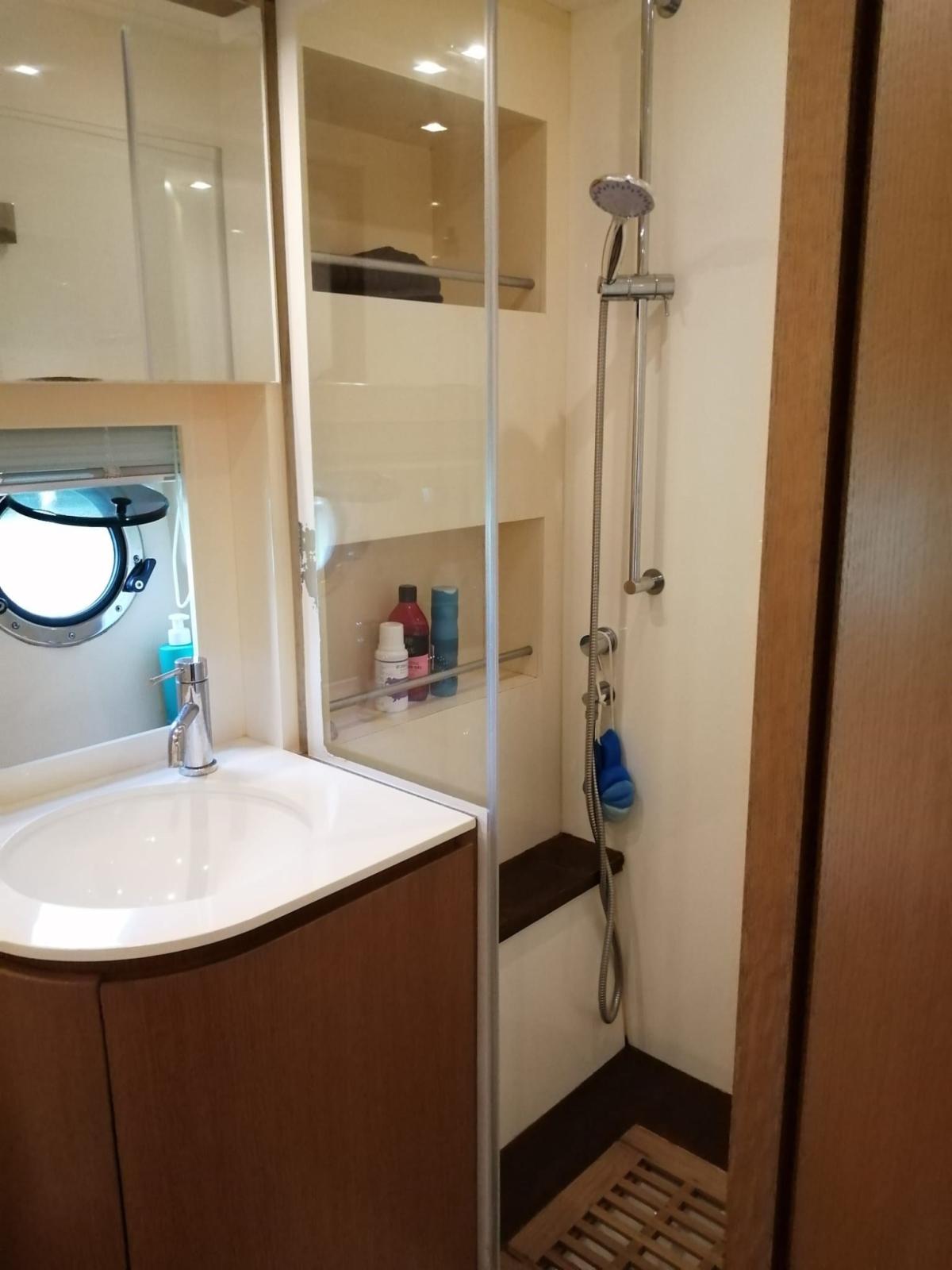 CABINE PRINCIPALE PLEINE POUTRE AU CENTRE DU NAVIRE AVEC LIT DOUBLE ET SALLE DE BAIN ATTENANTE AVEC CABINE DE DOUCHE