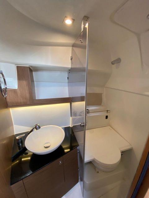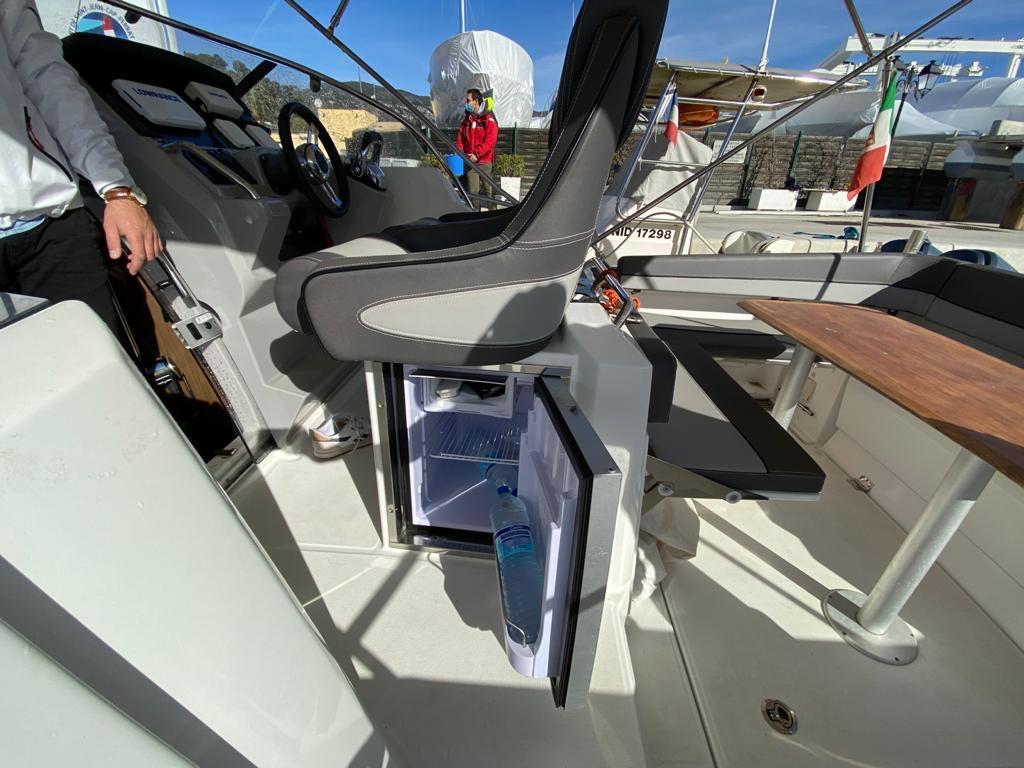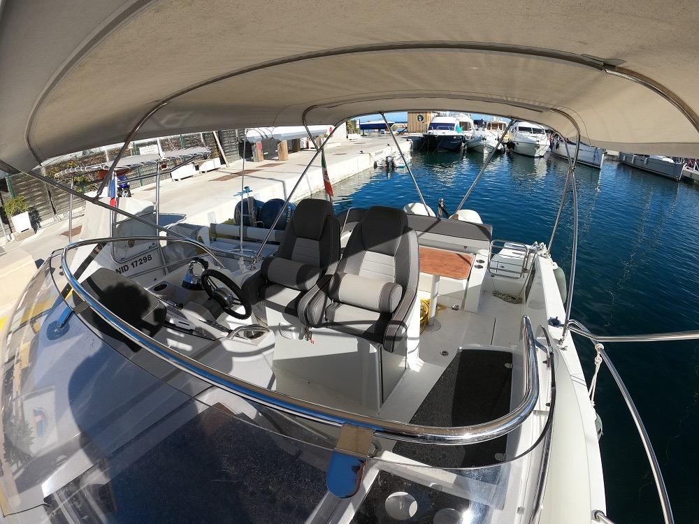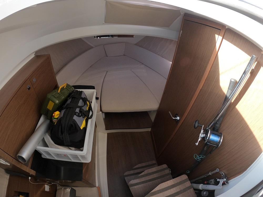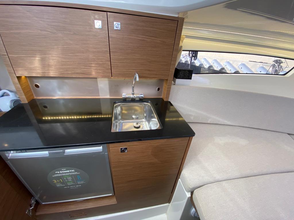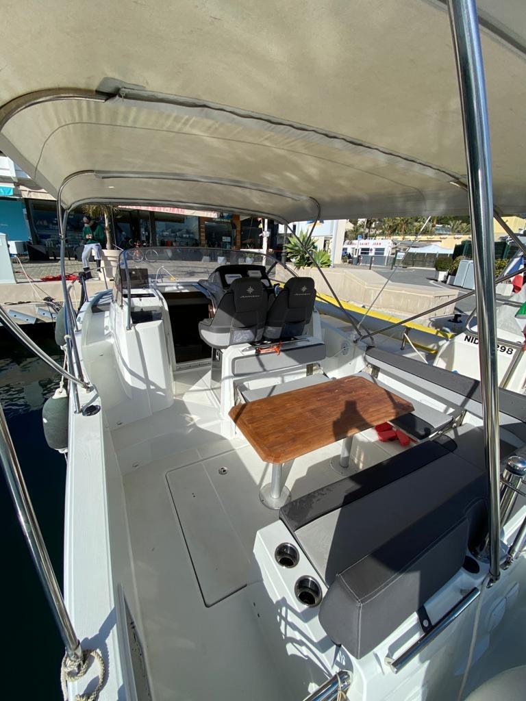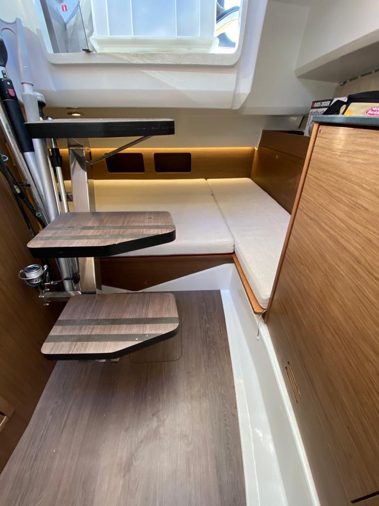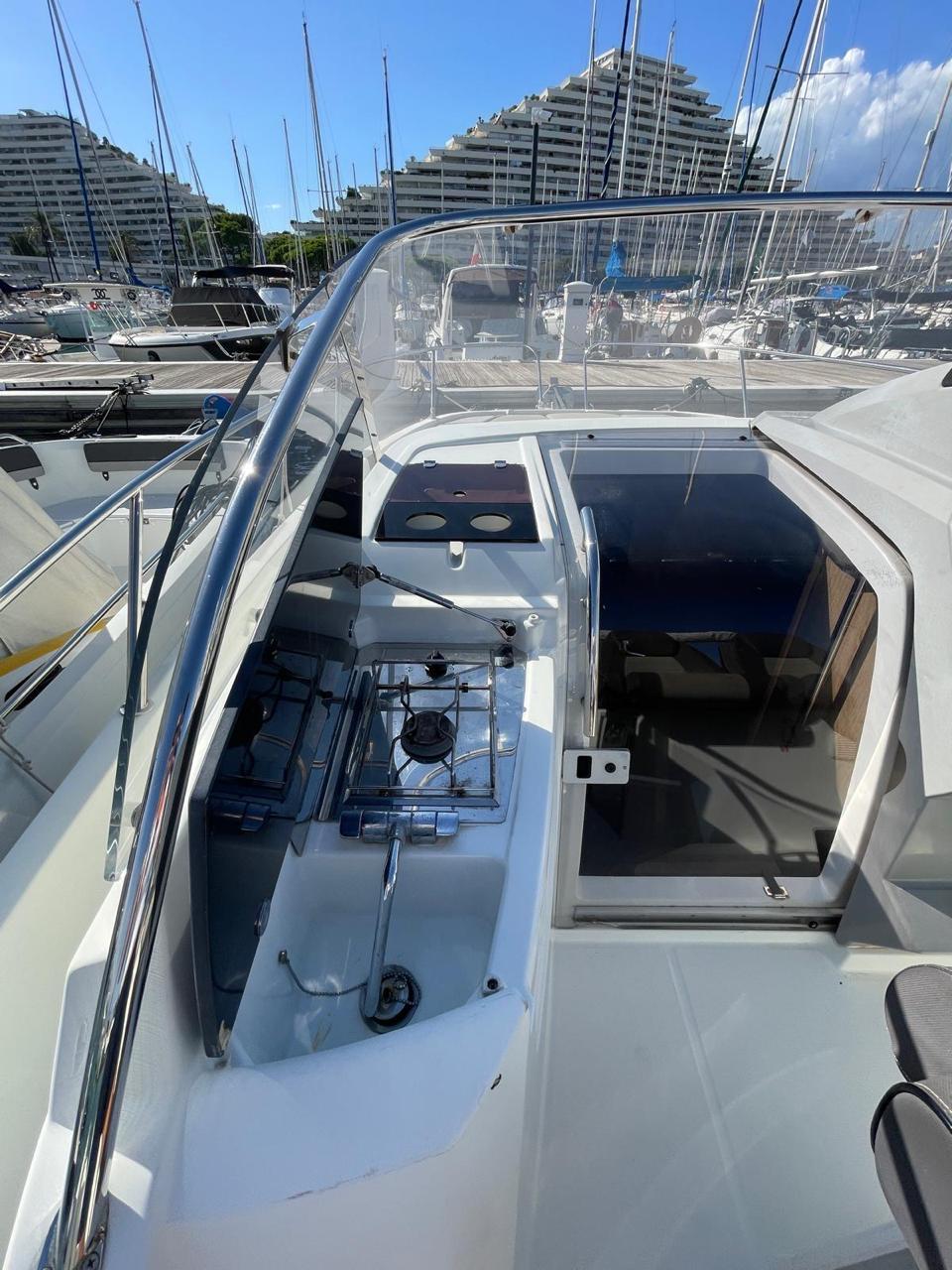 Le vaste bain de soleil avant peut accueillir confortablement plusieurs personnes. Le cockpit central offre un espace modulable avec banquette en U, table amovible et nombreux rangements. La généreuse plateforme arrière avec échelle inox facilite l'accès à l'eau. L'intérieur révèle une cabine lumineuse avec couchette double en V, salle d'eau complète avec toilettes et douche, et coin cuisine équipé avec réfrigérateur. Les nombreux hublots et le toit ouvrant panoramique inondent l'intérieur de lumière naturelle.