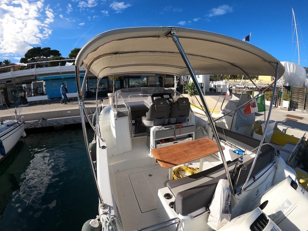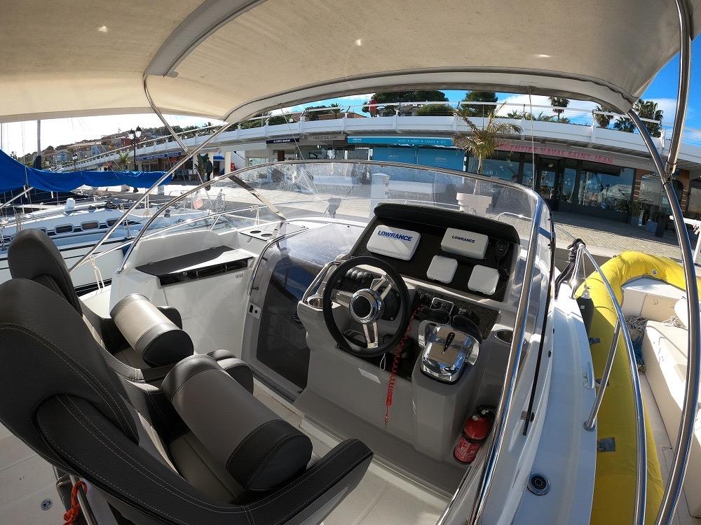 L'électronique de navigation moderne comprend GPS/traceur, sondeur et VHF. Le bateau dispose d'un guindeau électrique, douchette de pont, échelle de bain télescopique, taud de soleil bimini et système audio Bluetooth.