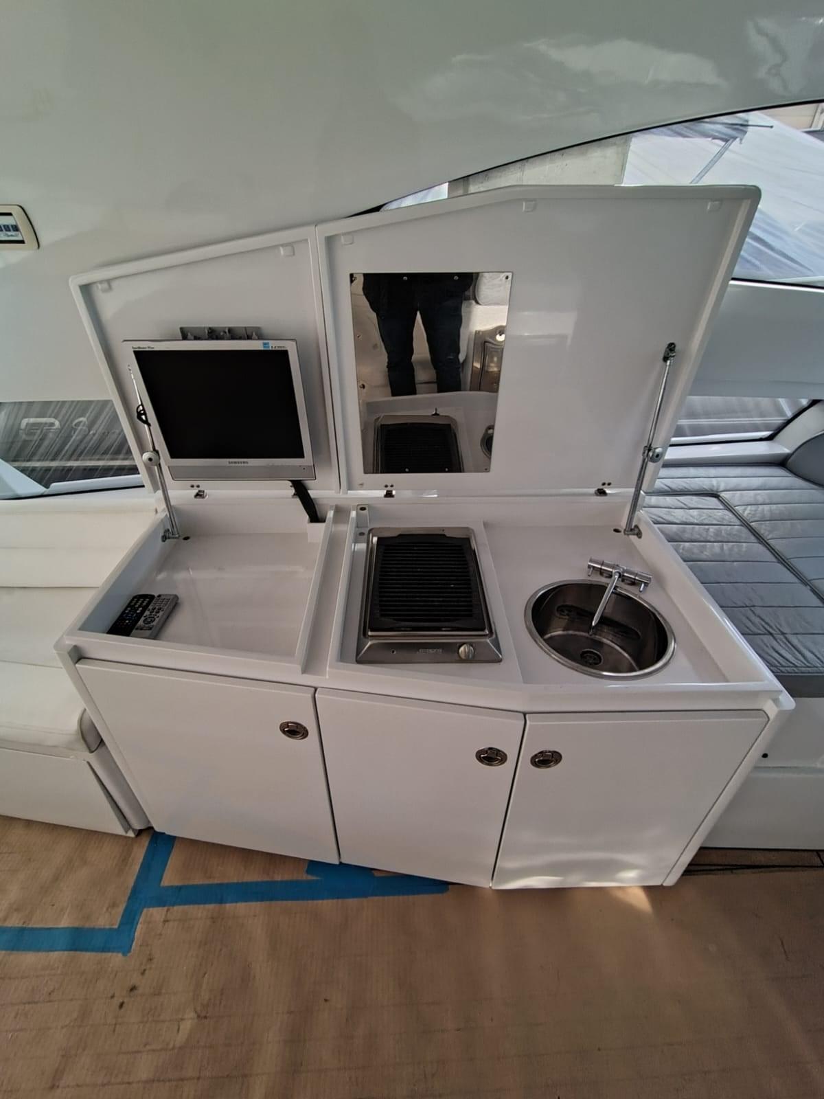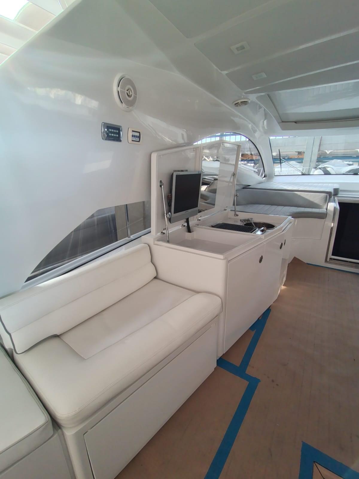 Alarme moteur, Alarme de pompe de cale, Alternateur, Ouverture du compartiment moteur électrique, Eau sous pression, Filères, Douche de cockpit, Phare de poursuite, Flaps hydrauliques, Hard top, Extincteur(s) fixe(s), Indicateurs de flaps, Lavage de chaine, Lavabo dans le cockpit, Éclairage de courtoisie, Spots sous-marins, Défenses, Passerelle, Plateforme arrière, Pompe de cale automatique, Pompe de Lavage du Pont, Cockpit en teck, Prise de quai, Connexion eau sous pression à quai, Rollbar, Guindeau électrique, Echelle de bain, Système de filtration des eaux usées, table de cockpit, Table pliante de salon, Corne, Winch électrique arrière, Winch électrique avant.