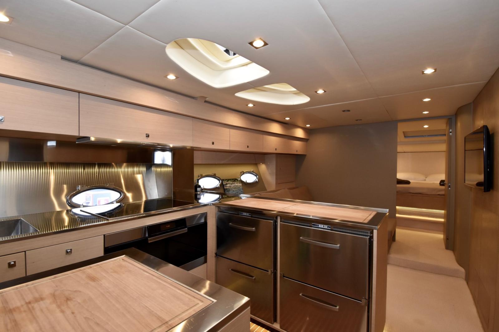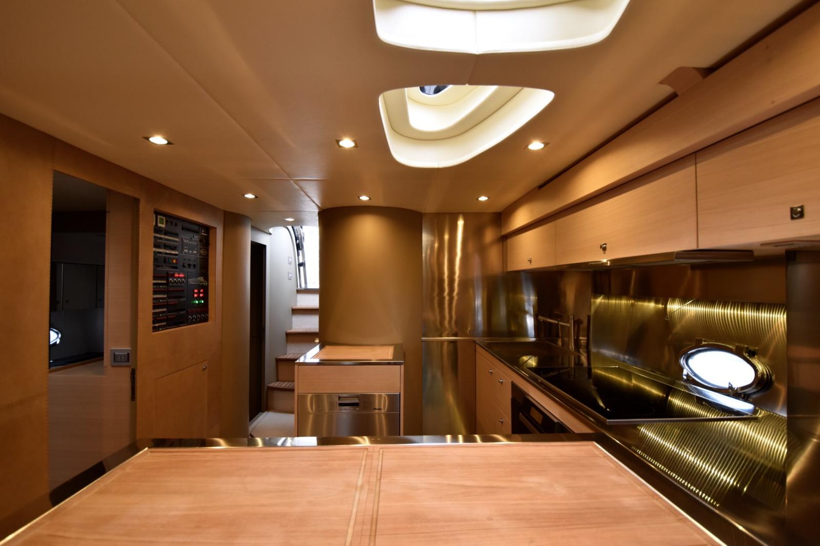 Four (90 cm Miele), Réfrigérateur extérieur, 2 Réfrigérateur intérieur (Vitrifrigo), Glacière (Indel), Lave et sèche-linge (Bosch), Lave-vaisselle (Miele), Winecooler.