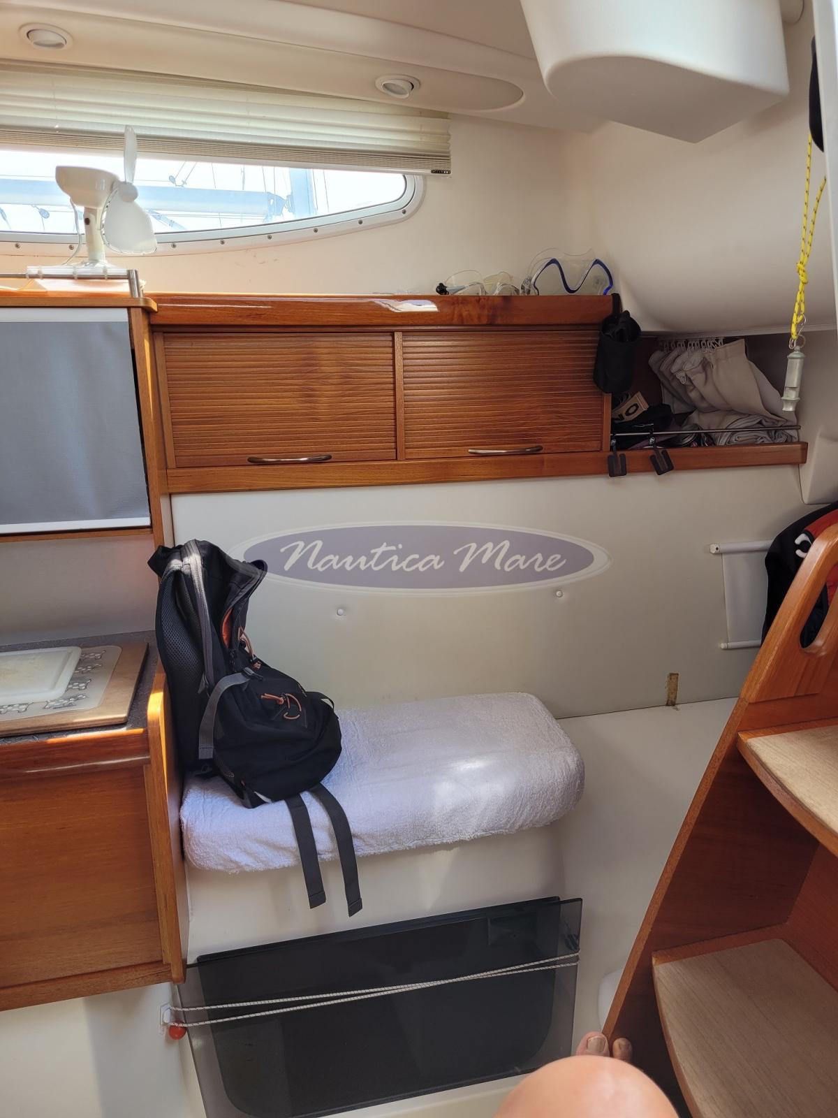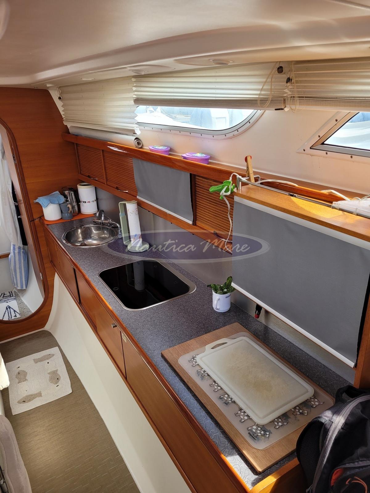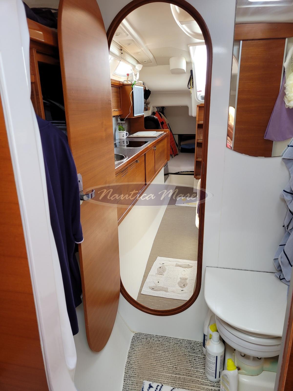 2 Ancre (Spade 7 kg. in alluminio con 13 kg. di catena da 8 mm. calibrata e 37 mt. di cima. Grappino Malingri inox smontabile 12 kg), Eau sous pression, 4 Batteries (70 Ah AGM), Chargeur de batterie (Mastervolt), Douche de cockpit, Propulseur d'étrave (4 kW a scomparsa), Moteur hors-bord pour annexe (2,5 hp), 3 Panneau solaire (Solbian 2 x 100 W + 1 x 56 W con regolatore), Prise de quai, Guindeau électrique (Quick 1000 W), Gréement monotoron (in Dyform originale (sostituito strallo di prua)), Echelle de bain, Annexe (con motore fuoribordo Honda 2,5 hp), 4 Winch (2 Andersen da 36 self tailing per fiocco, 2 per trasto randa da 30 self tailing), Winch électrique (Andersen da 46).