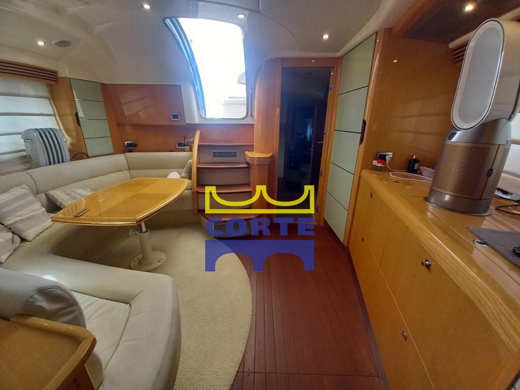 Alarme moteur, Alarme de pompe de cale, Eau sous pression, Douche de cockpit, Phare de poursuite, Flaps hydrauliques, Garage à annexe, Lavabo dans le cockpit, Passerelle (elettroidraulica a scomparsa), Plateforme arrière (di poppa in teak), Pompe de cale automatique, Porte latérale, Cockpit en teck, Prise de quai, Guindeau électrique, Echelle de bain, table de cockpit, Corne.