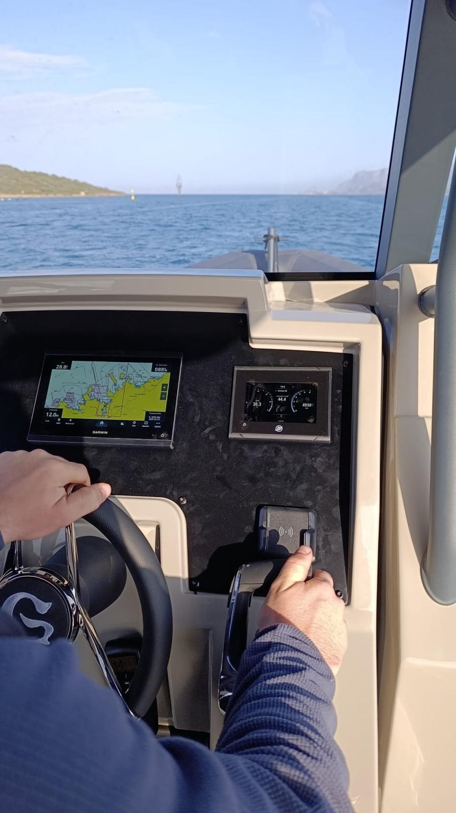 La console intègre une instrumentation moderne avec un affichage embarqué, ce qui vous permet d’avoir toutes les informations de navigation principales sous contrôle de manière claire et immédiate. À bord, il y a aussi un système audio Fusion avec quatre haut-parleurs connectés via Bluetooth, idéal pour accompagner la journée en mer avec votre musique préférée, ainsi qu’un chargeur sans fil pratique pour votre smartphone.