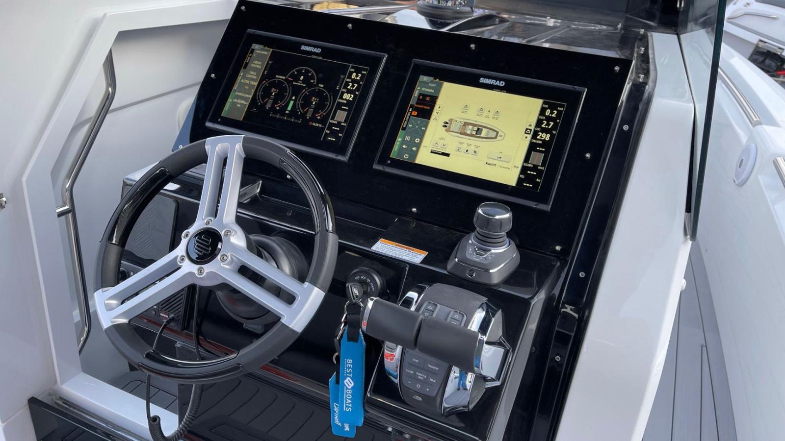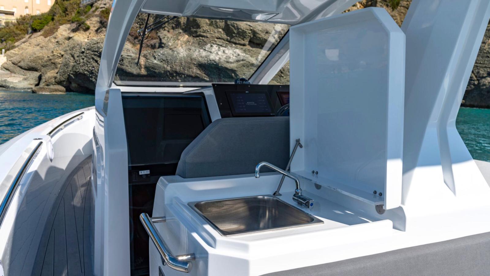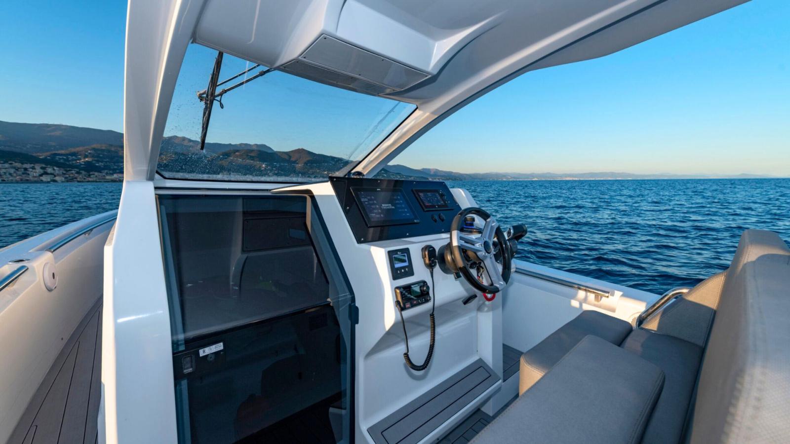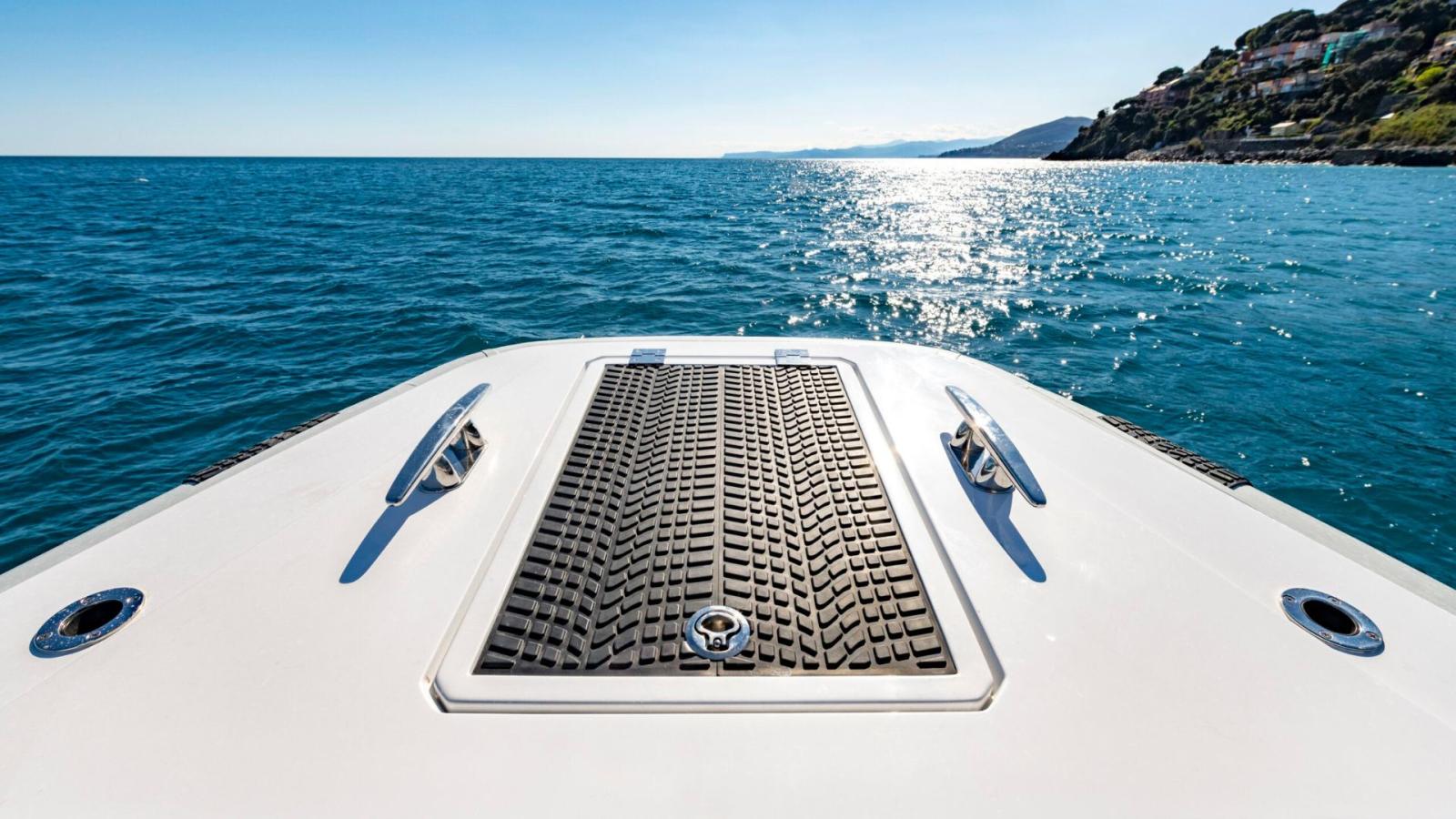 Propulsé par deux moteurs hors-bord Mercury Verado de 300 HP, le Pirelli 35 garantit une accélération exaltante et une tenue de mer exceptionnelle, grâce à sa carène à double étape avancée.