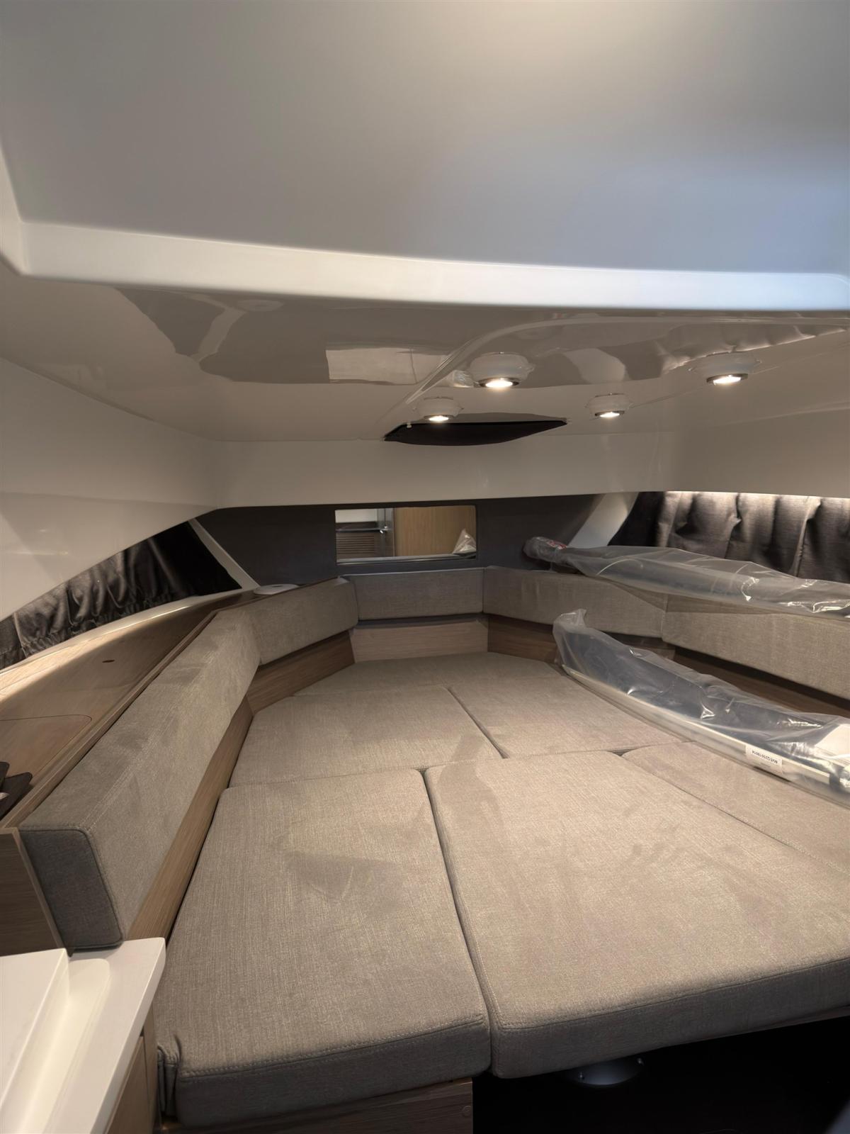 PILOT EDITION Décoration coque Pilot Edition Pilot Edition Balcons en acier inoxydable T laqué noir (toit en polyester et carré en acier inoxydable noir) décorations Lumières sous-marines bleues Linetex Glacier + Sellerie en craie - Siège de cockpit avec dossier convertible en plateforme de bain de soleil - Banc de pilote et copilote de soutien - Pont de proue avec dossier mobile - Banc pliant derrière le poteau pour s’incliner Trappe ouvrante Lumières de courtoisie LED dans le cockpit Table en bois avec pied télescopique pouvant être transformée en plateforme de bain de soleil