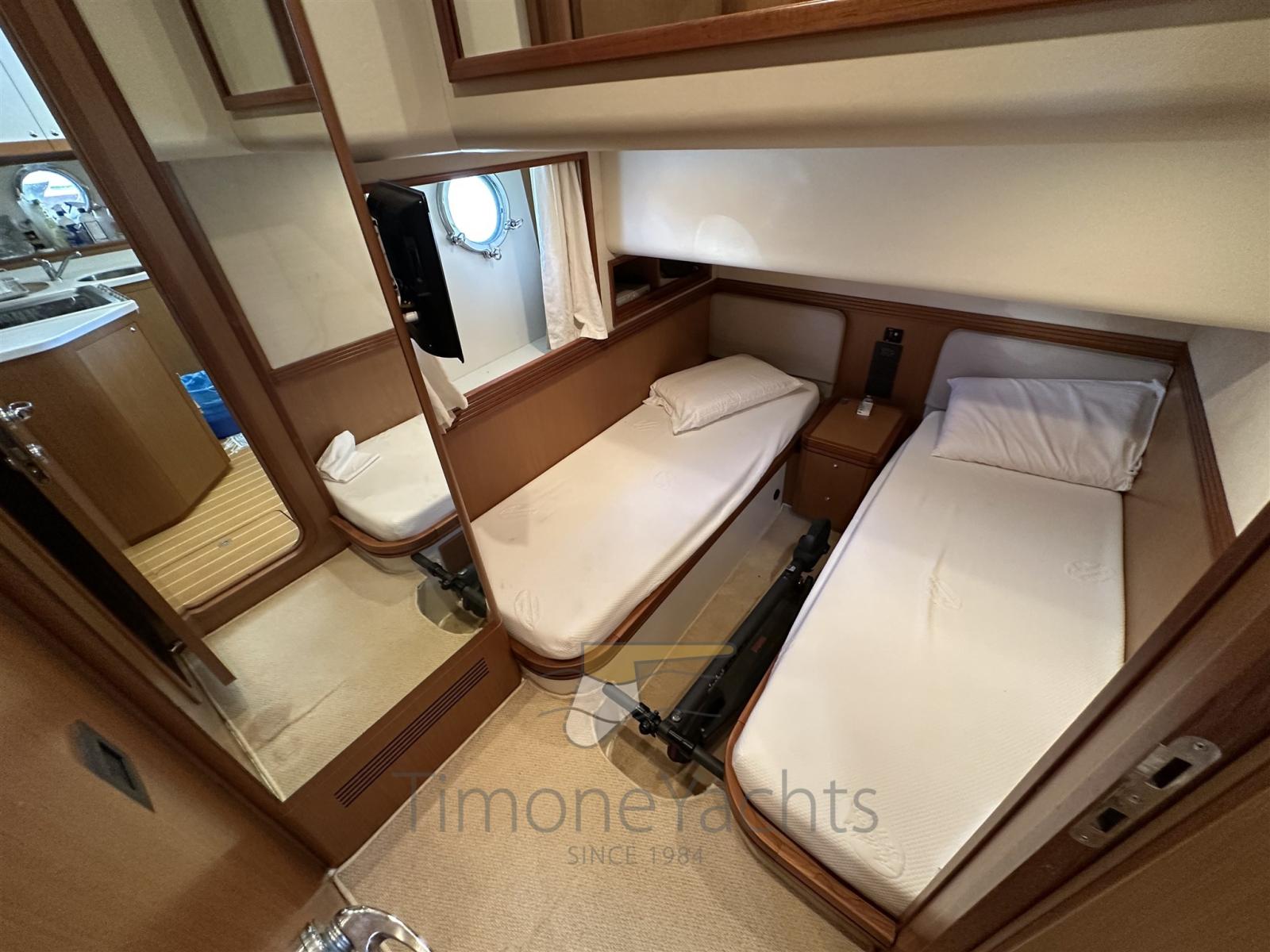 En descendant sous le pont, sur la gauche, on tombe immédiatement sur la cuisine en L, avec réfrigérateur, plaque à induction, four mixte et évier à double vasque. L’espace nuit est équipé de trois cabines : une pour la cabine propriétaire à l’avant et deux pour les invités, avec lits simples, au milieu du navire. Il y a deux salles de bains. Sous la plate-forme arrière se trouve une autre cabine simple, destinée à l’équipage.