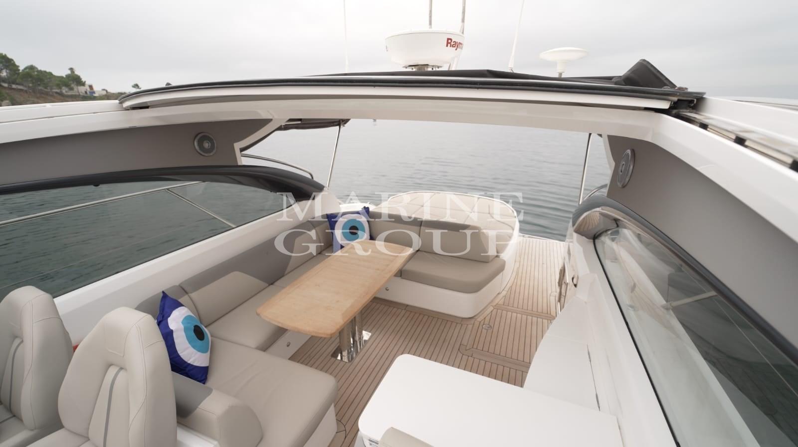 Douche de cockpit, Garage à annexe, Hard top, Lavabo dans le cockpit, Éclairage de courtoisie, Spots sous-marins, Passerelle (Elettro idraulica), Plateforme arrière (Affondante), Cockpit en teck, Prise de quai, Connexion eau sous pression à quai, Guindeau électrique, Echelle de bain, Stabilisateurs (Seakeeper), table de cockpit, Table pliante de salon, Corne.