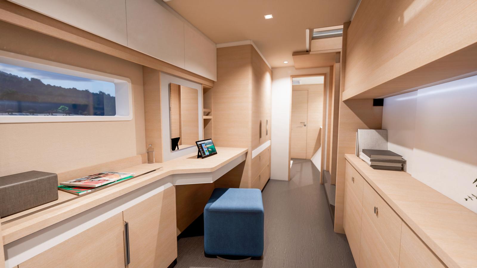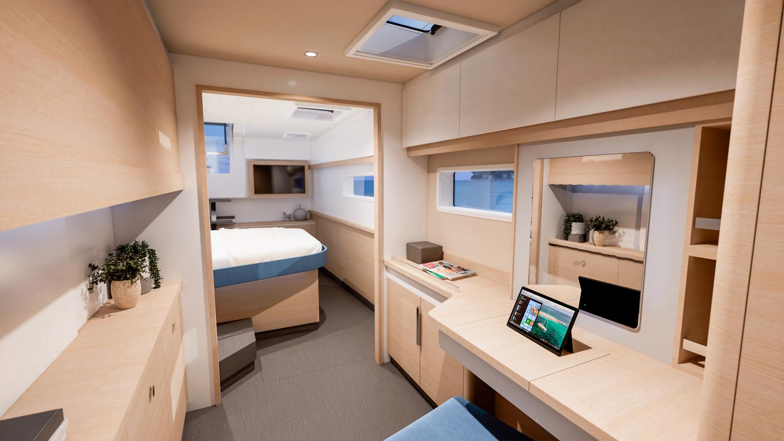 Le New FP | 48 est disponible en version Maestro - 3 cabines ou en version Quintet - 5 cabines. D'une part, la version Maestro vous offre de grands espaces lumineux et la possibilité de personnaliser la cabine avec un meuble bas ou bureau, et un volume avant en grande salle de bain, en cabine bébé ou atelier au choix. D'autre part, la version Quintet offre 4 grands lits doubles, orientés face à la mer, et une cabine avec deux lits simples superposés, idéal pour les enfants ou membres d'équipage.
