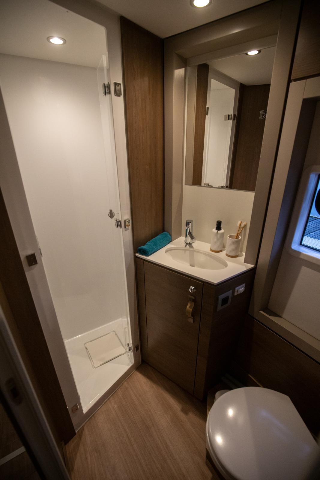 Pensé pour des croisières au long cours, il offre un équipement complet : climatisation réversible, dessalinisateur, groupe électrogène et lave-vaisselle, pour une vie à bord aussi agréable qu’à terre.
