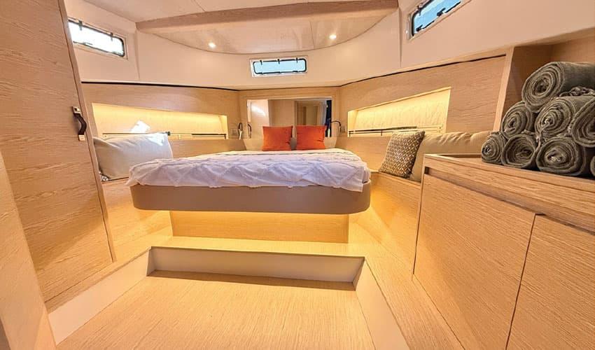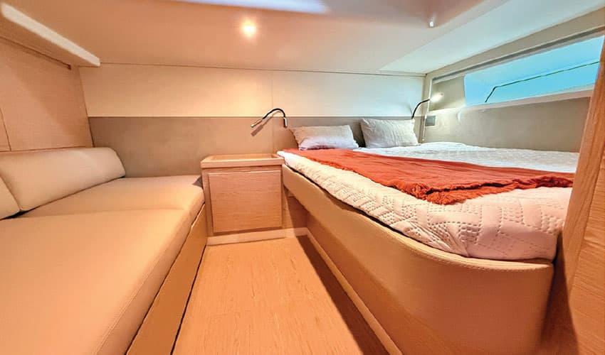 Ce dayboat premium combine élégance et performance avec 2 moteurs Volvo Penta IPS 650 (480 ch), joystick, et intercepteurs automatiques. Son intérieur spacieux offre une cabine propriétaire climatisée et une cuisine fonctionnelle. Le pont en teck inclut balcons hydrauliques, bain de soleil arrière électrique, tenderlift et T-Top avec inserts carbone. Équipé d’une électronique avancée Volvo (écrans multifonction, pilote automatique) et d’un éclairage LED.