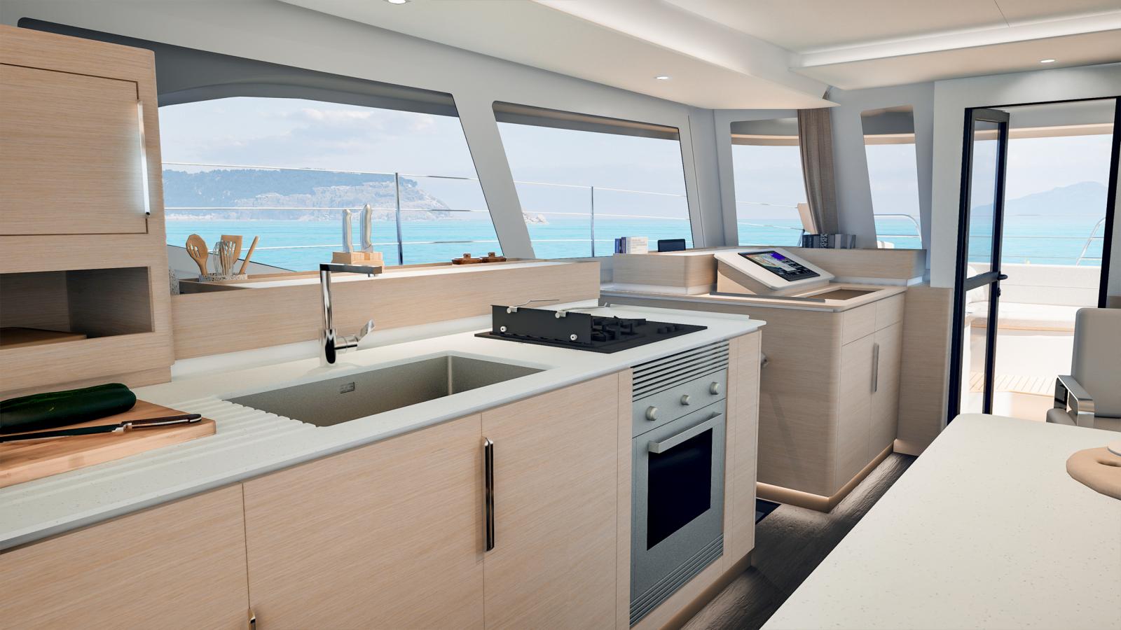 Le NEW FP | 55 ouvre les portes de la grande plaisance et intègre toutes les dernières innovations en matière d'équipements, d'aménagements et de technologies à bord. Grâce à ses 17 mètres de longueur, le FP 55 bénéficie de vastes espaces intérieurs conviviaux et baignés de lumière. La ventilation naturelle du carré est assurée par une large baie coulissante et une porte d'accès directe au cockpit avant, un aménagement jusqu'ici réservé aux modèles Flagships de la marque. Unique en son genre, le FP 55 est également le premier catamaran de la gamme à possédé un large Flybridge avec poste de barre centralisé, regroupant toutes les manœuvres et offrant une vue panoramique à 360°. Pour sa taille, le FP 55 est le seul catamaran à proposer deux suites propriétaires identiques, situées dans chacune des coques, tout en conservant deux cabines d'équipage indépendantes et entièrement équipées.