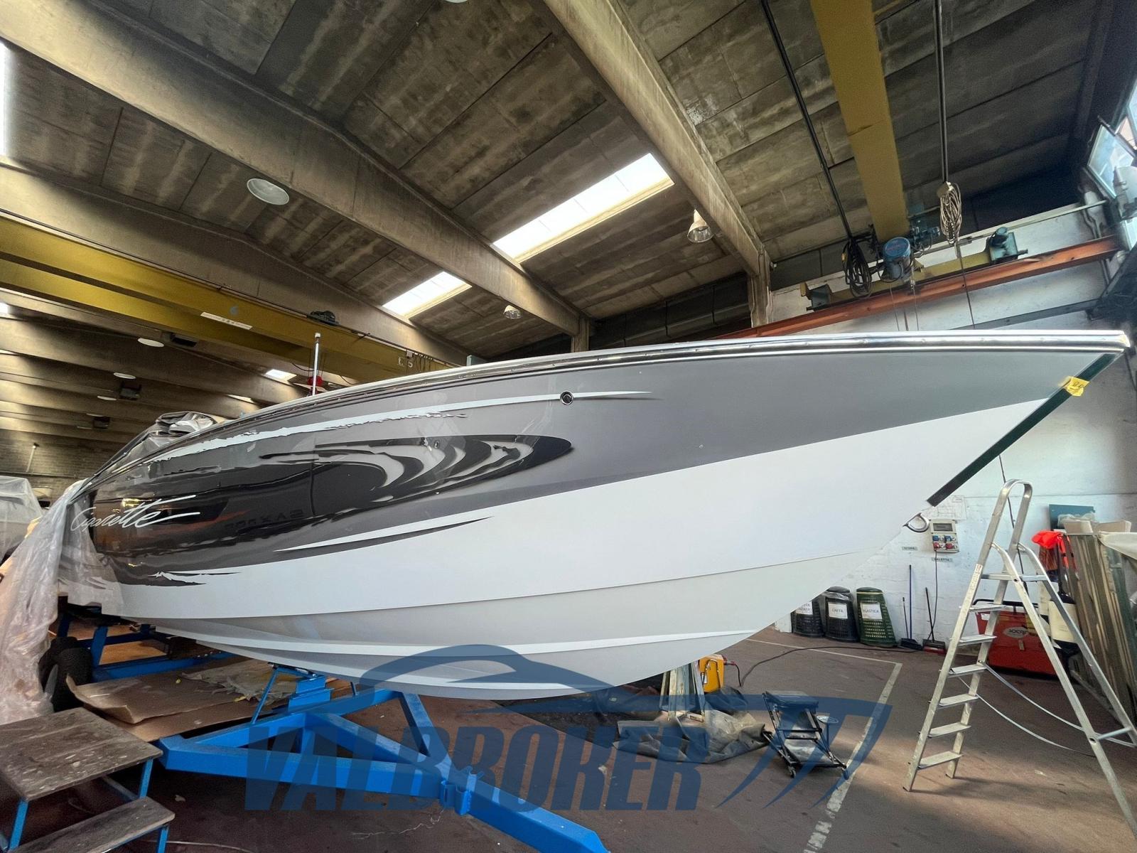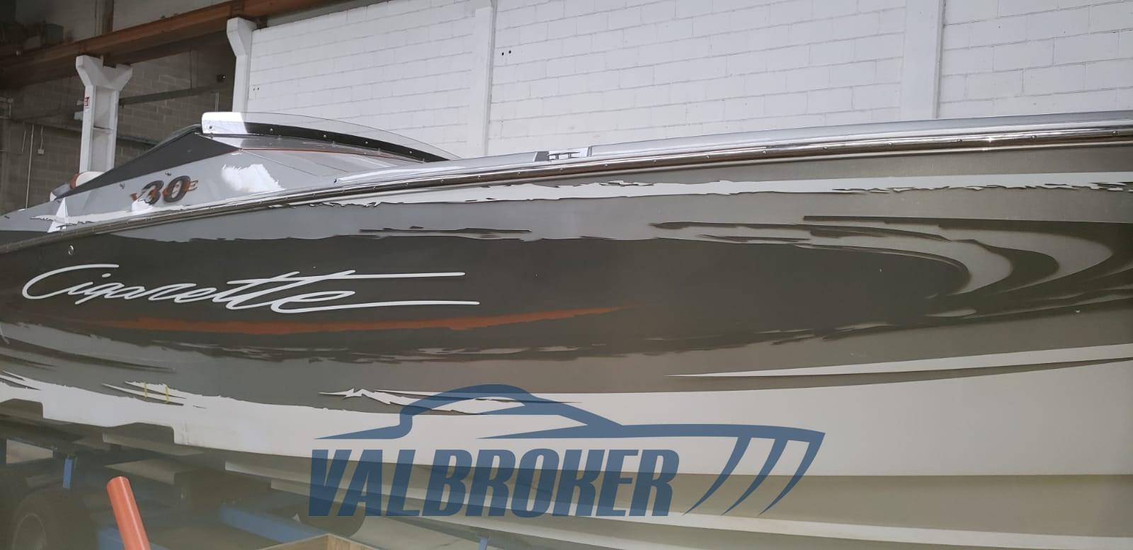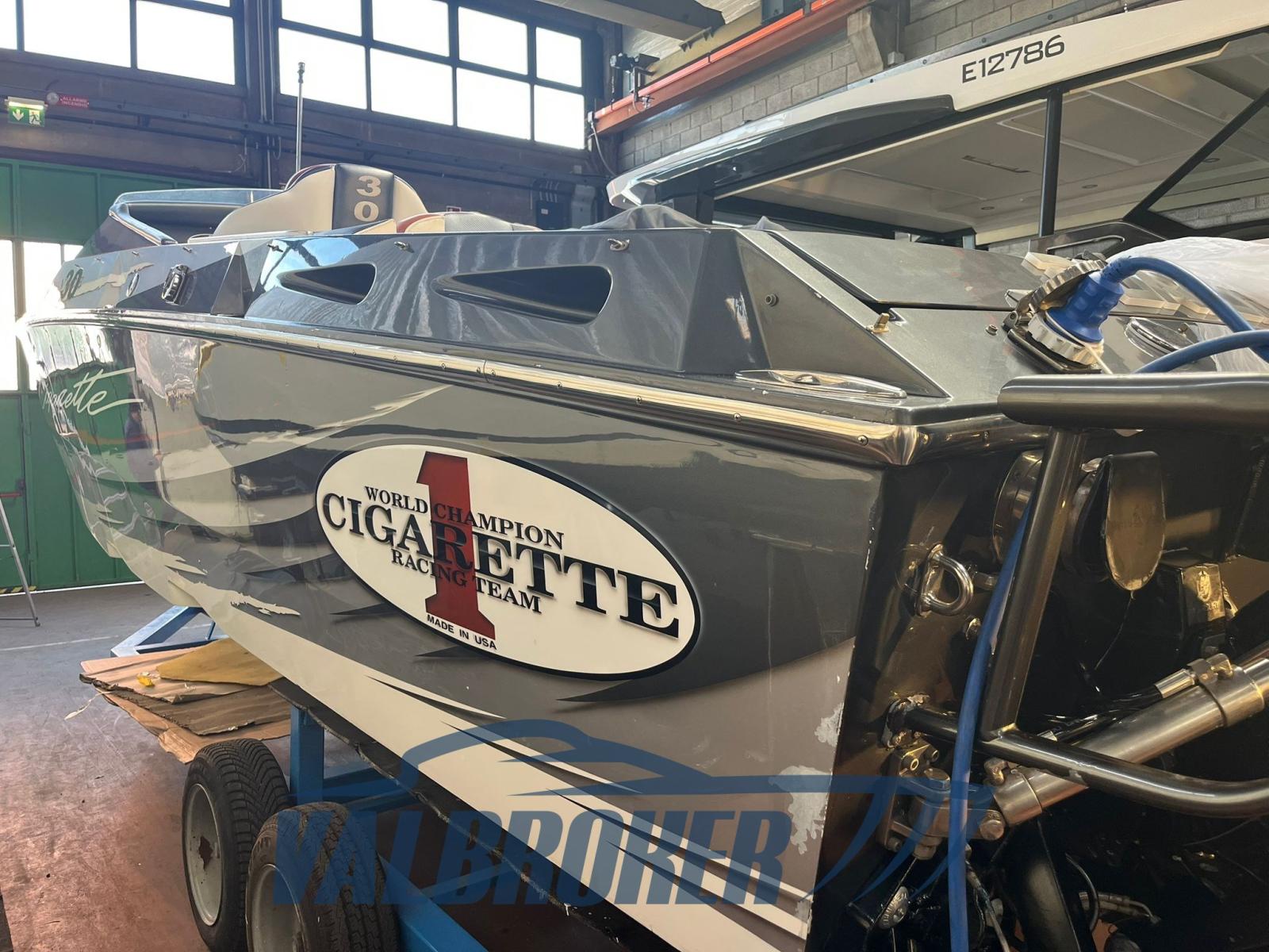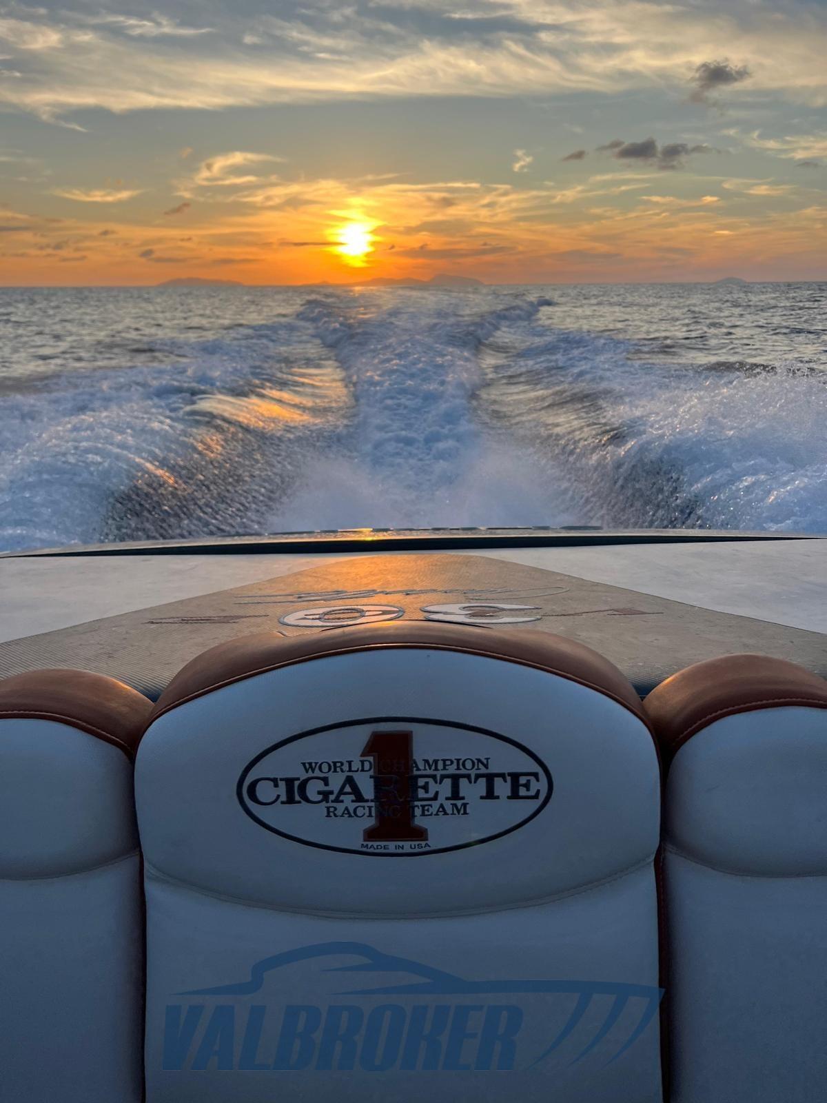 Optionnel : système d’eau douce à circuit fermé. Ordinateur Smartcraft Mercury, commandes moteur Mercury Racing, volets Mercury Racing. Sièges intérieurs en cuir sportif avec logo Cigarette 1, plancher dinette à l’aspect carbone, carénage spécial avec redanse de course. Collecteurs d’échappement à remplacer.
