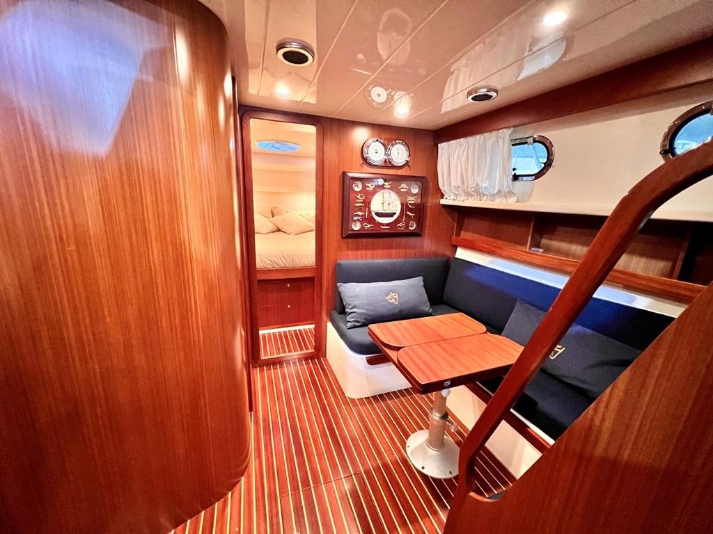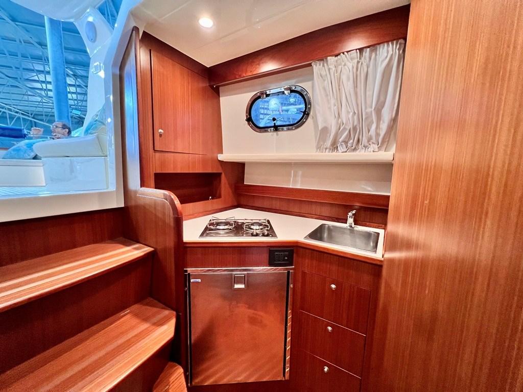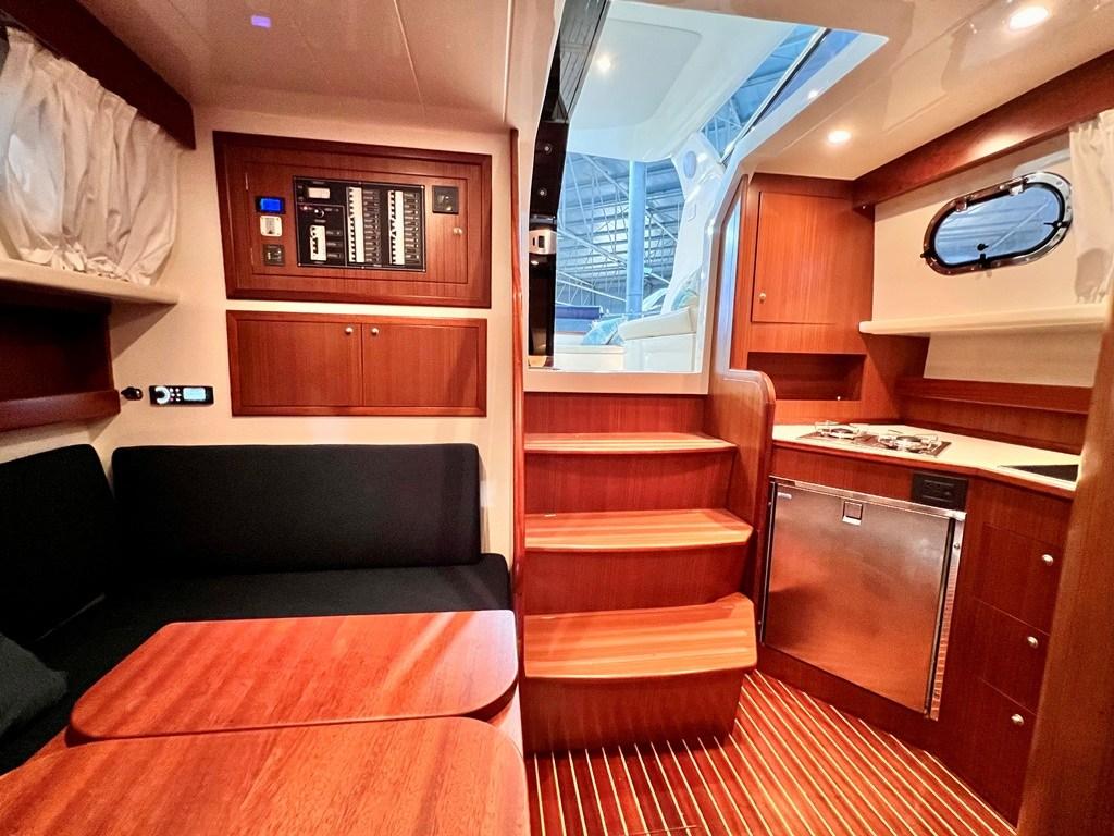 La cuisine immédiatement à gauche en entrant, bien que sous le pont, est visible depuis le cockpit et est en fait adjacente et communique avec l’extérieur.