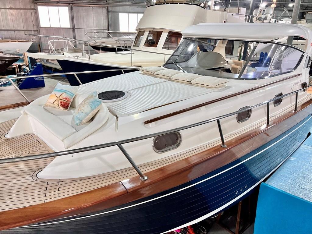 Eau sous pression, Couleur spéciale (Fiancate Blu Navi), Douche de cockpit, Flaps électriques, Hard top (Apribile), Extincteur(s) fixe(s), Plateforme arrière (con calpestio in teach), Pompe de cale automatique, Pont en teck, Porte latérale, Cockpit en teck, Prise de quai, Guindeau électrique, table de cockpit, Table pliante de salon (trasfromabile in cuccetta), Winch électrique avant.