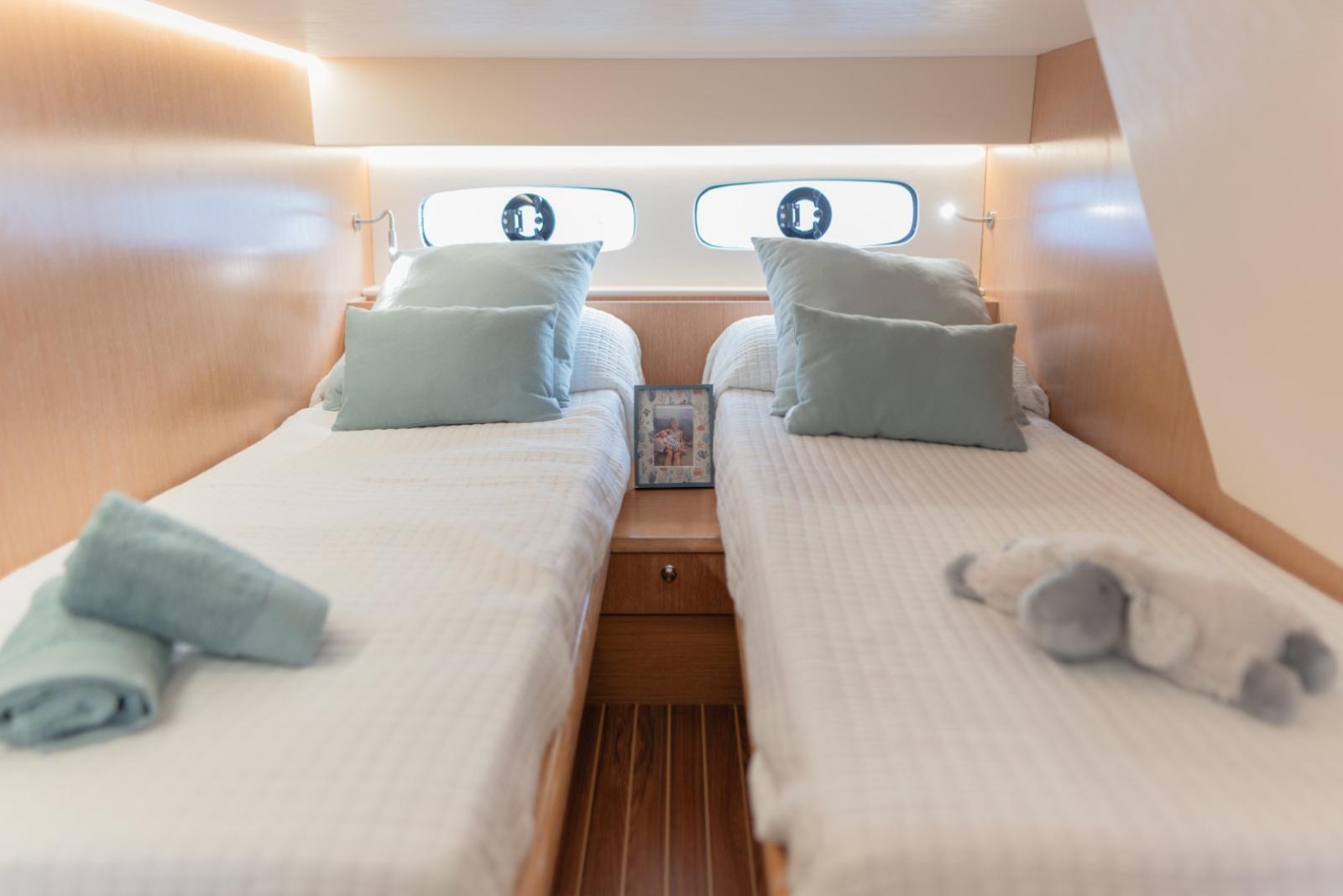 Carré transformable, WC électrique, Pré-installation air conditionné (2 unités), Baie vitrée d'accès au salon en bois vernis Iroko, 4 battants, Cuisine avec plan de travail imitation marbre couleur blanc, Evier en inox avec mitigeur, accastillage, Eaux noires.