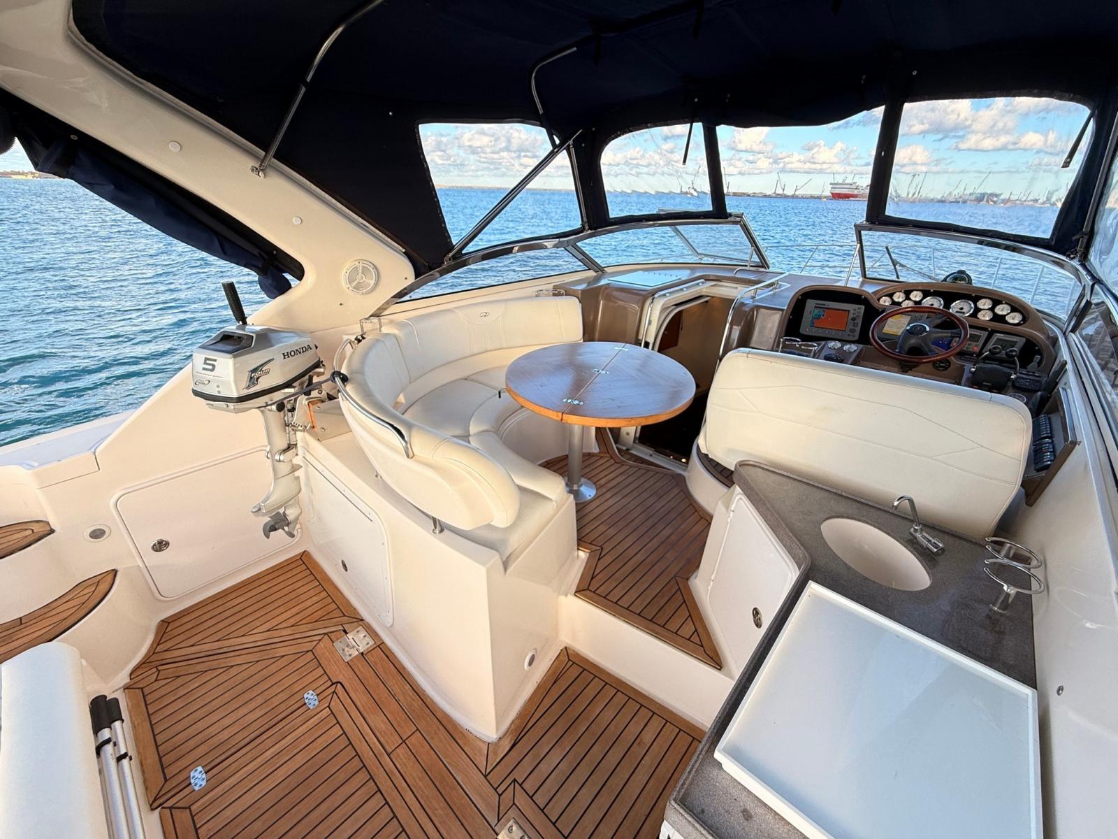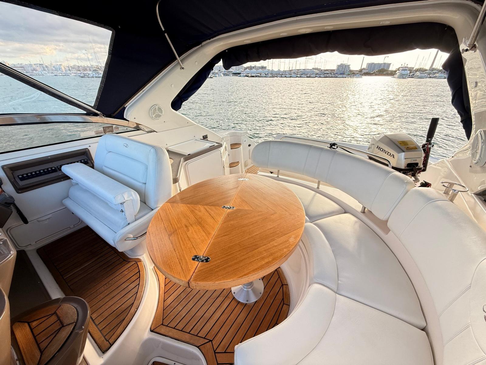 À l’extérieur, un cockpit spacieux avec un grand canapé en forme de U, une table centrale, un réfrigérateur, une cuisinière et un pont de soleil arrière ; Idéal pour la vie en plein air et la croisière côtière.