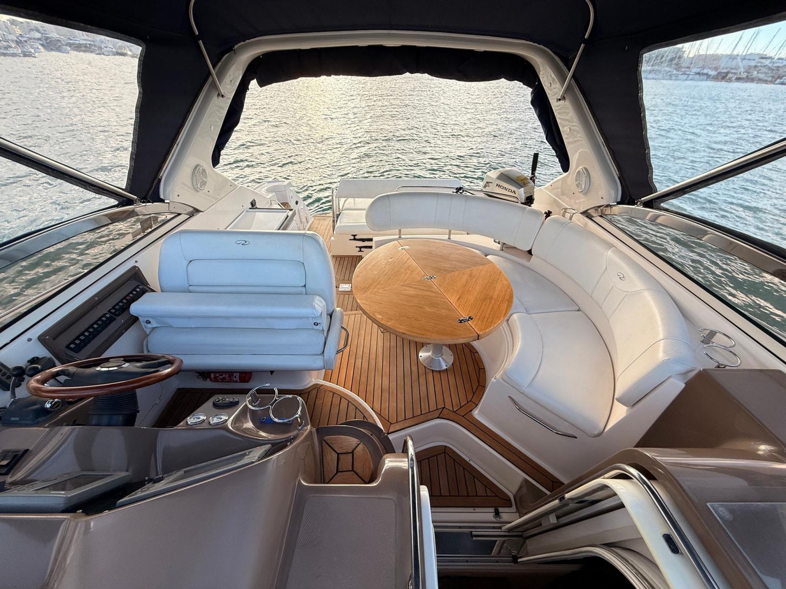 Eau sous pression, 5 Batteries (2025 (2 MOTORI 2 SERVIZI 1 GRUPPO ELETTROGENO)), Câble d’alimentation à quai, Filères, Douche de cockpit, Flaps électriques, Extincteur(s) fixe(s), 2 Panneau solaire, Défenses, Plateforme arrière, Pompe de cale manuelle, Porte latérale, Cockpit en teck, Prise de quai, Connexion eau sous pression à quai, Onduleur, Rollbar, Guindeau électrique, Echelle de bain, Chaise support HB, table de cockpit, Table pliante de salon.
