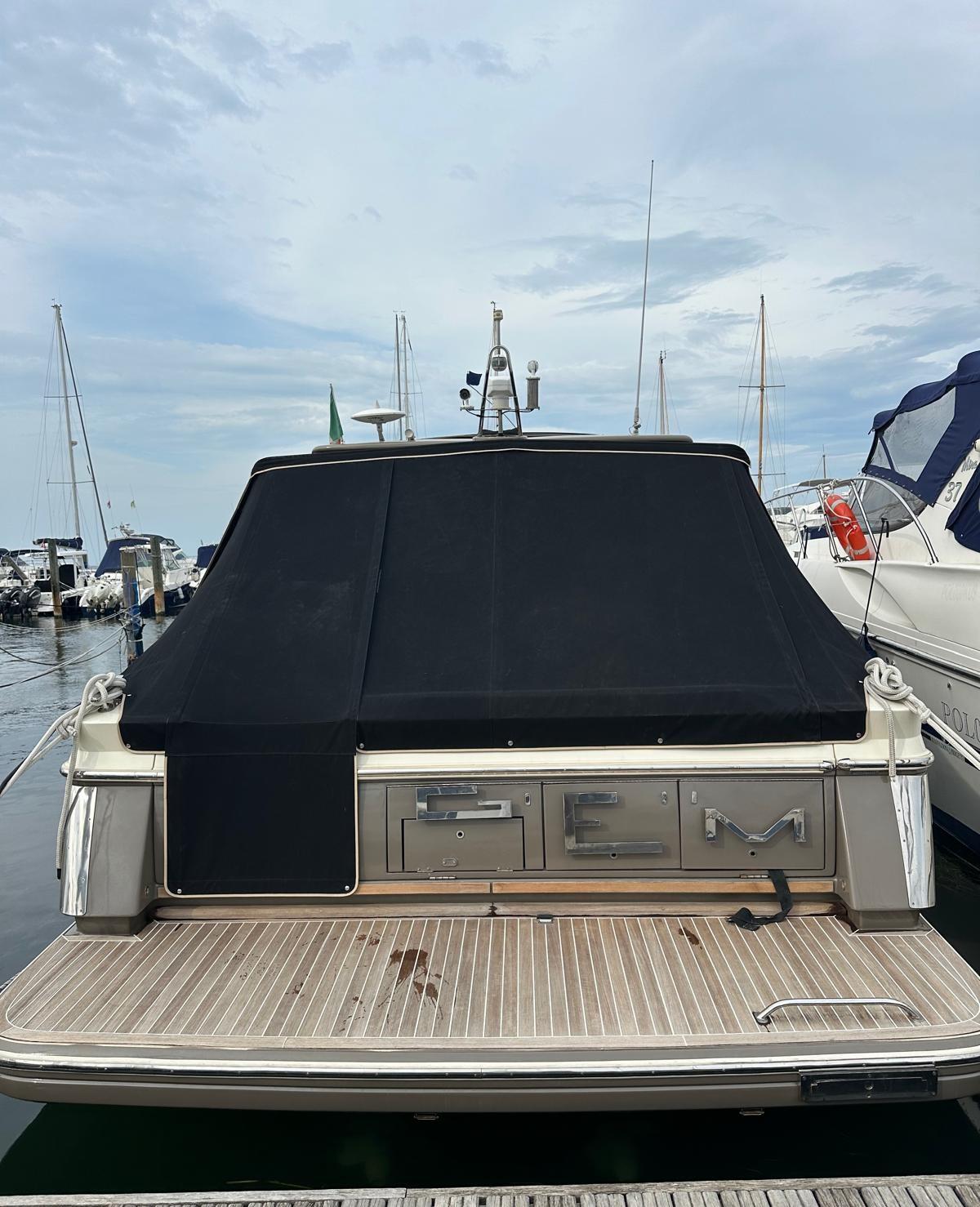 Eau sous pression, 4 Batteries, Chargeur de batterie (SHARK 40A 12V), Couleur spéciale, Douche de cockpit, Phare de poursuite, Flaps fixes, Spots sous-marins, Passerelle, Plateforme arrière (teak), Pompe de cale automatique, Cockpit en teck, Prise de quai, Connexion eau sous pression à quai, Guindeau électrique (nuovo), Echelle de bain, table de cockpit, Annexe (+ fuoribordo 6hp), Corne.