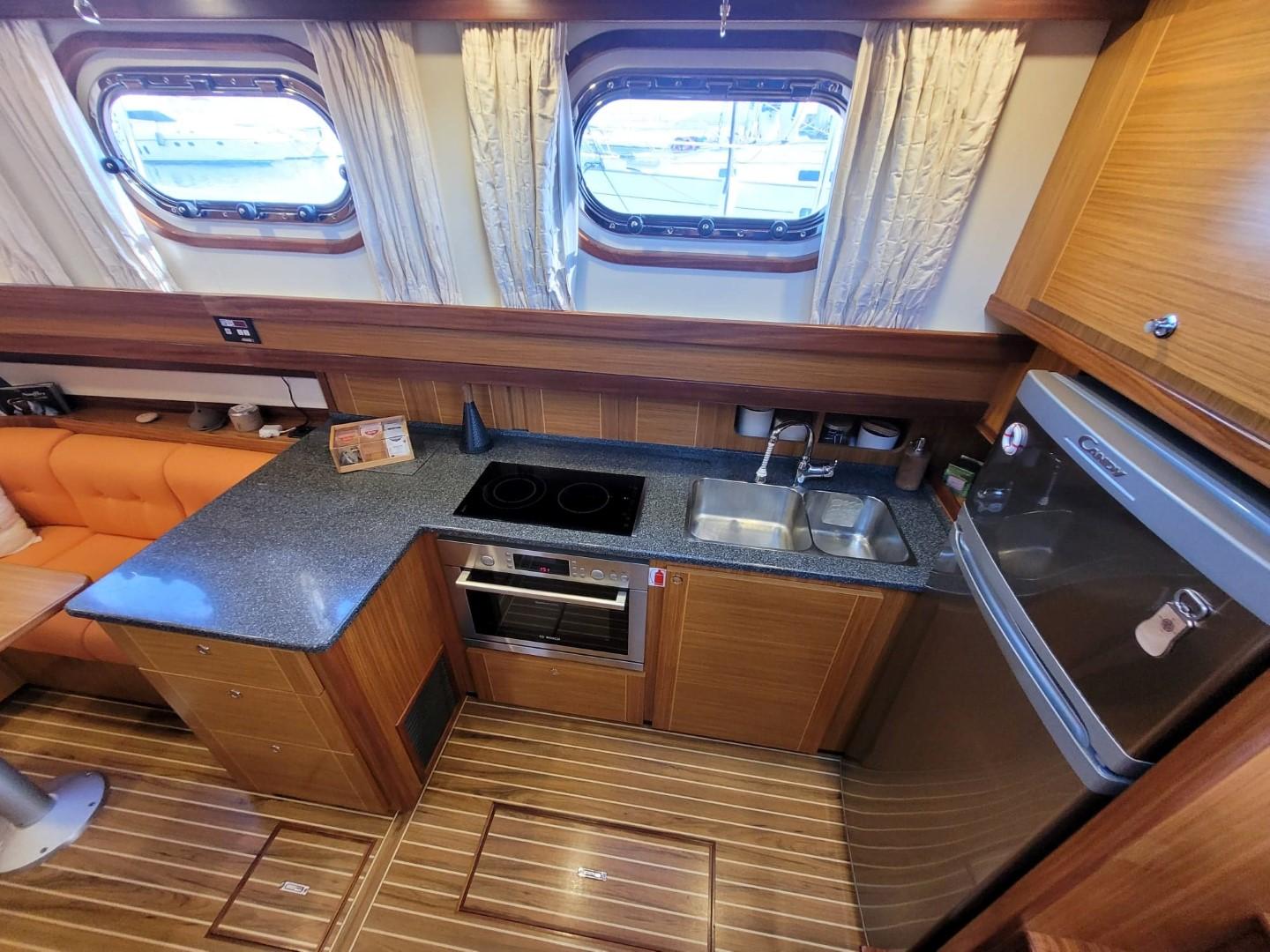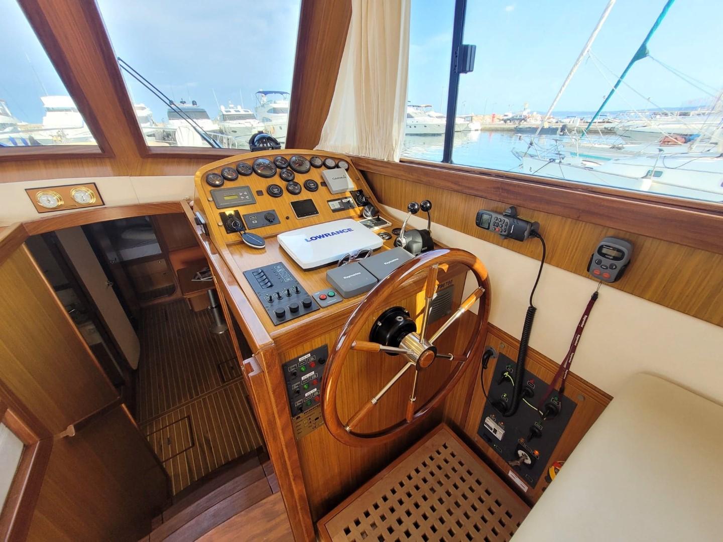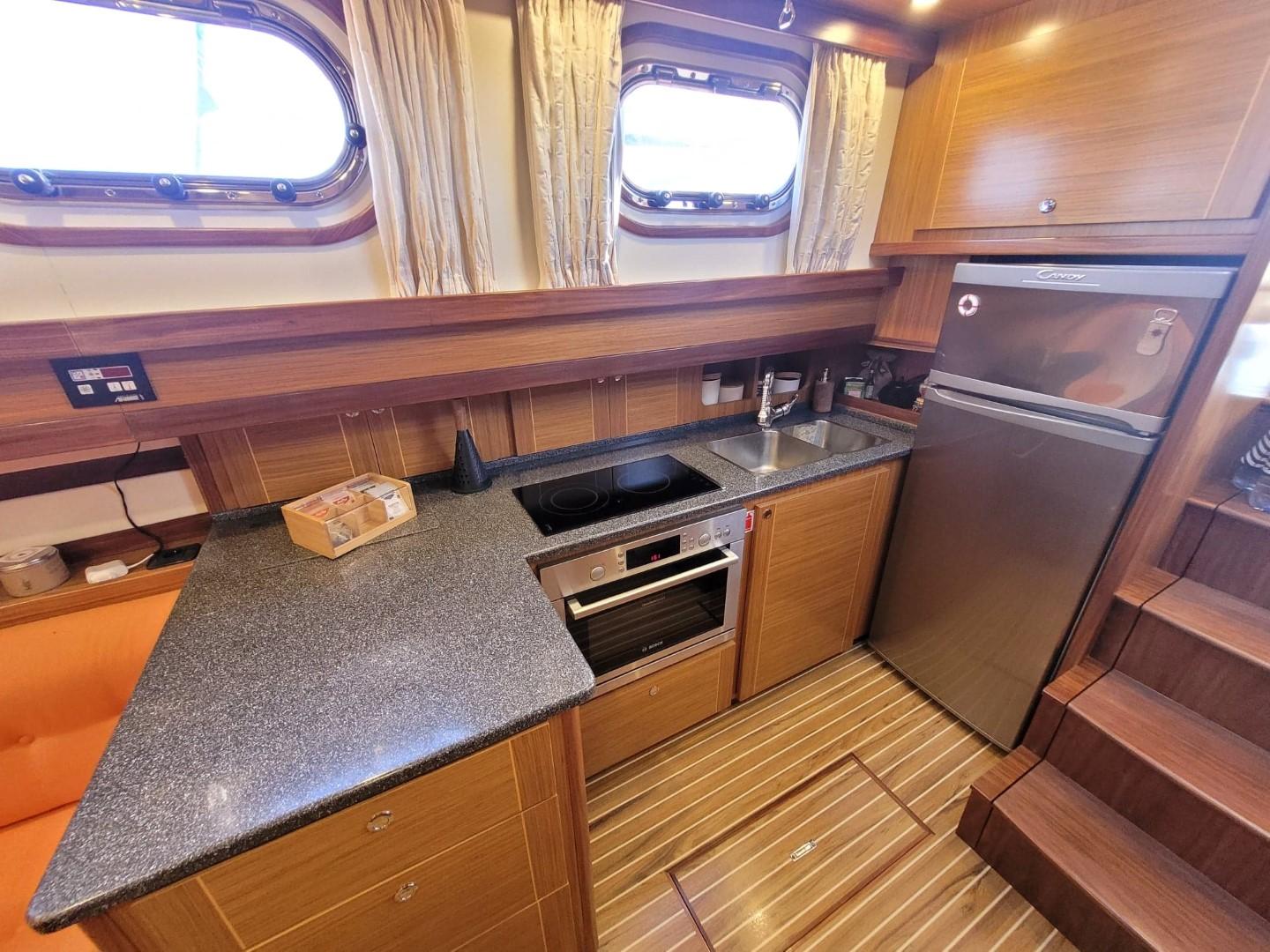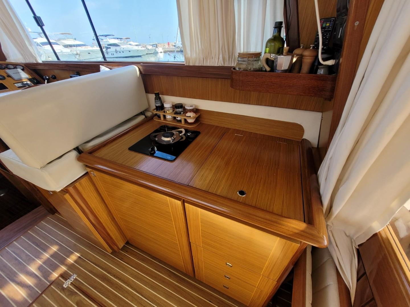 A l'intérieur en entrant, on trouve à babord une grande banquette en L et à tribord le poste de pilotage et un coin cuisine d'appoint avec un feu + un évier + un frigo.