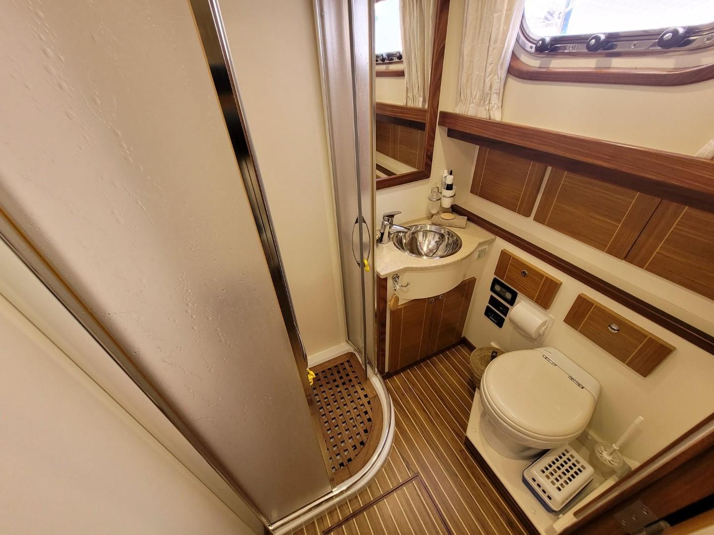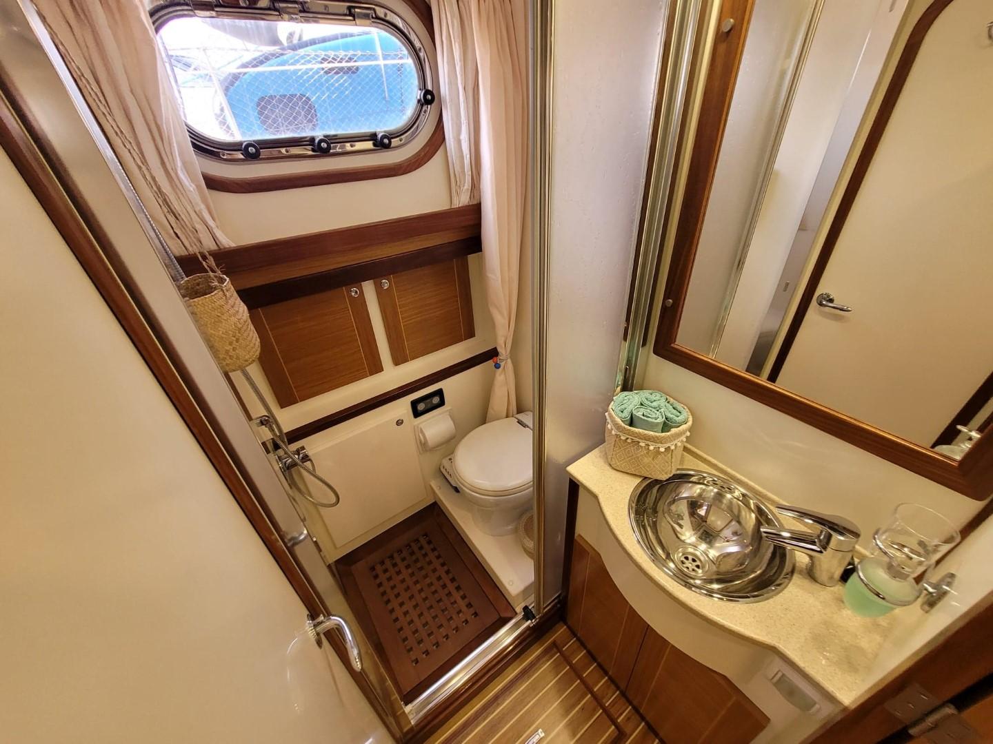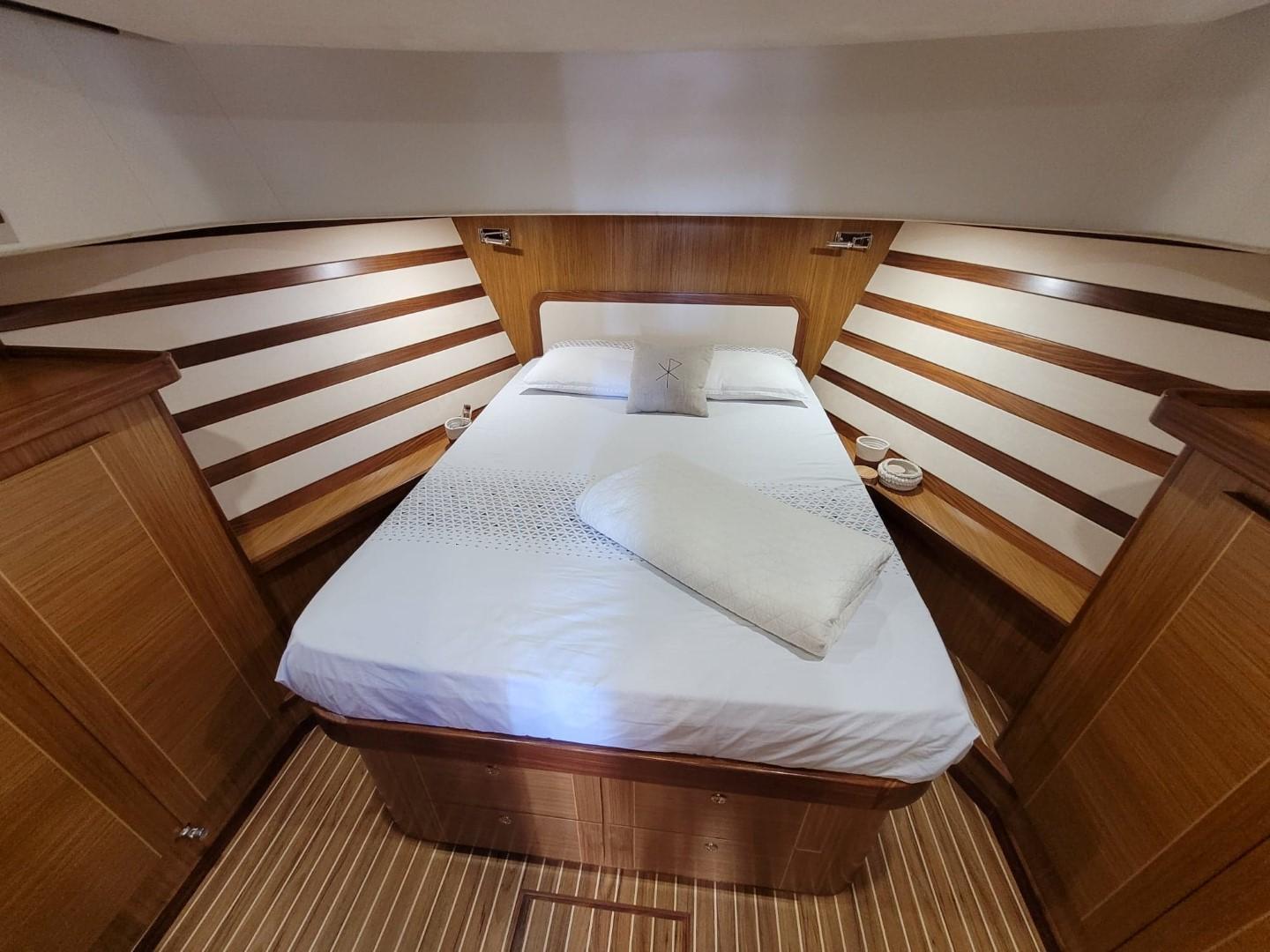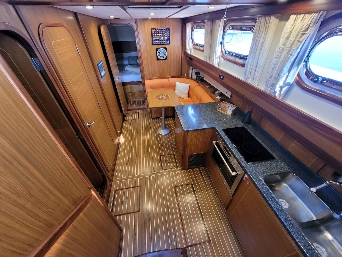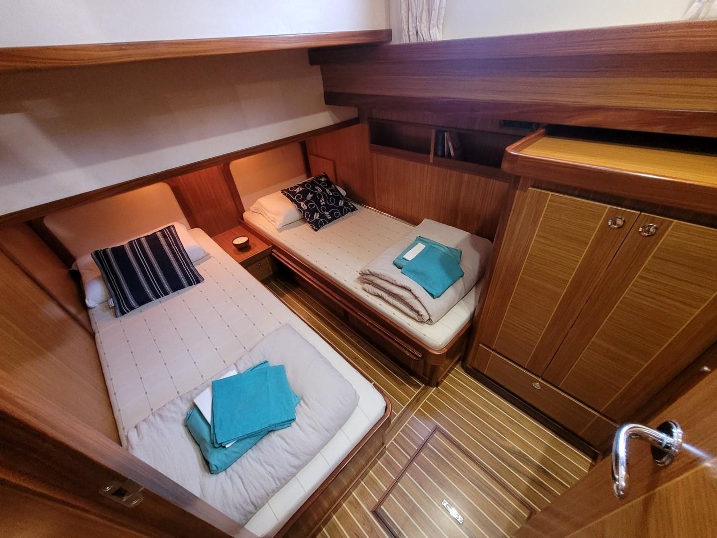 Cette banquette en L peu se transformer un couchage double. En contrebas, la hauteur sous barrots de 2 m donne une rare sensation d'espace. On y trouve une grande cuisine avec un coin repas convertible également en couchage d'appoint, ainsi que deux cabines doubles indépendantes, possédant chacune son cabinet de toilette.