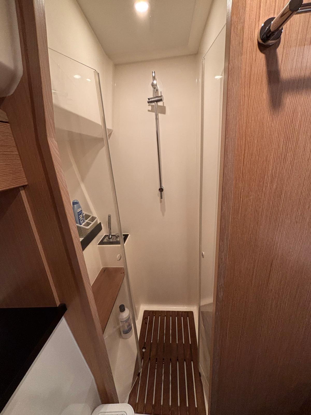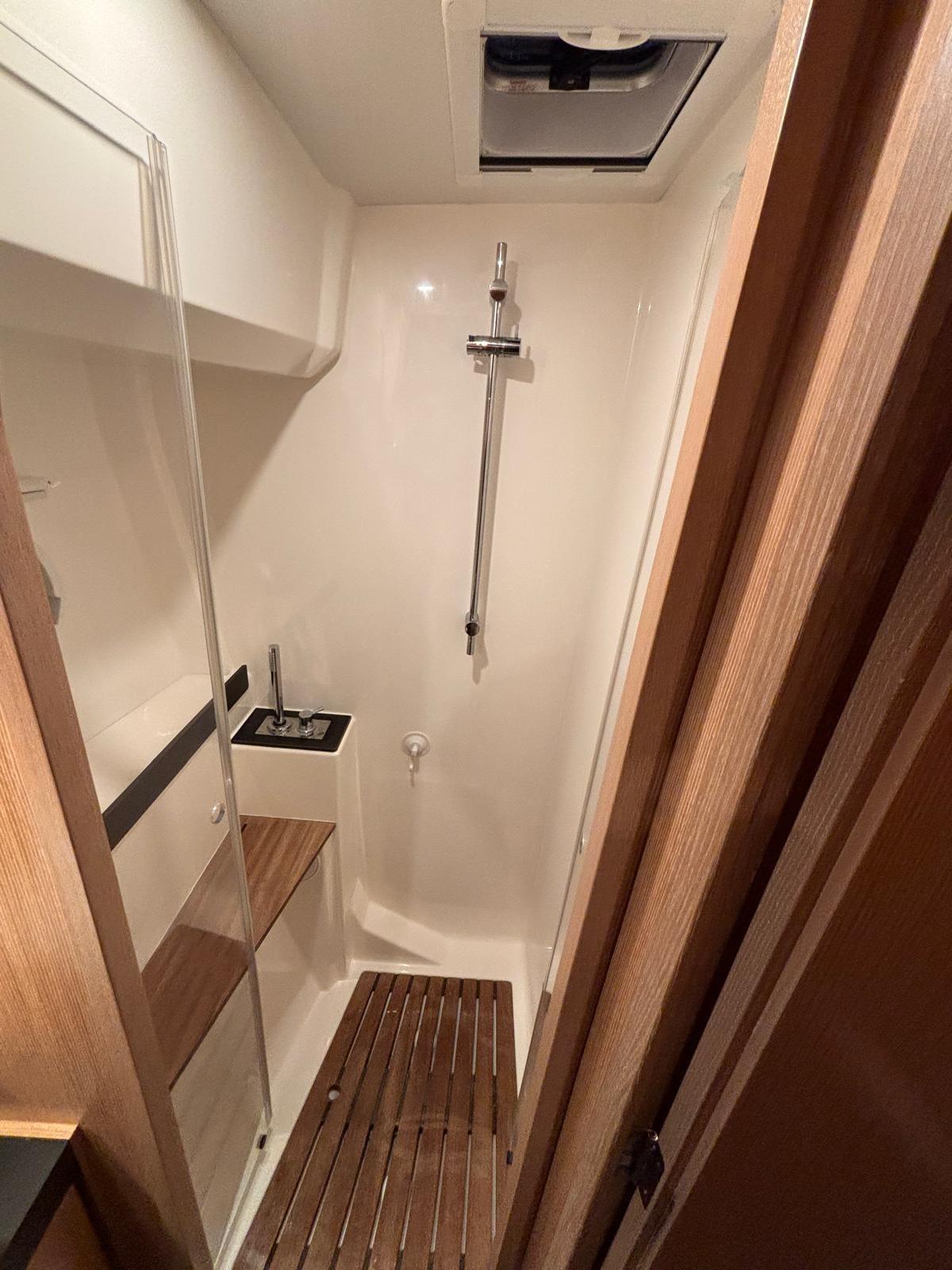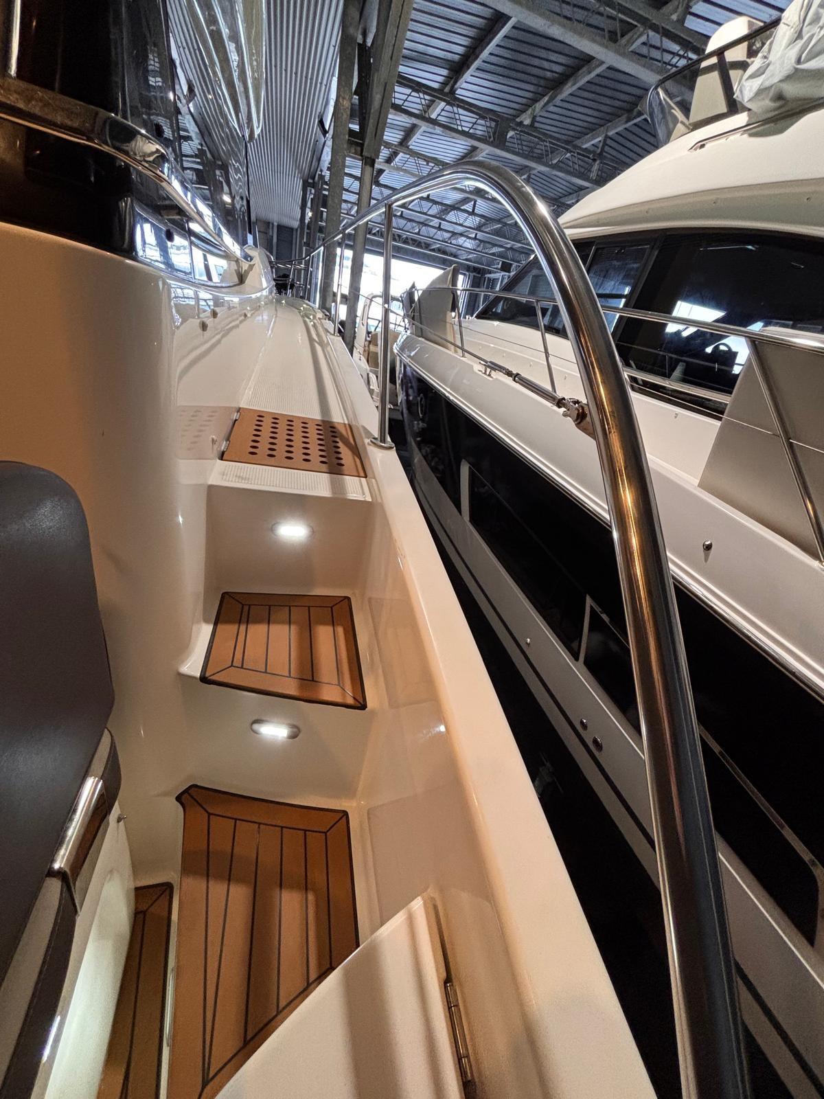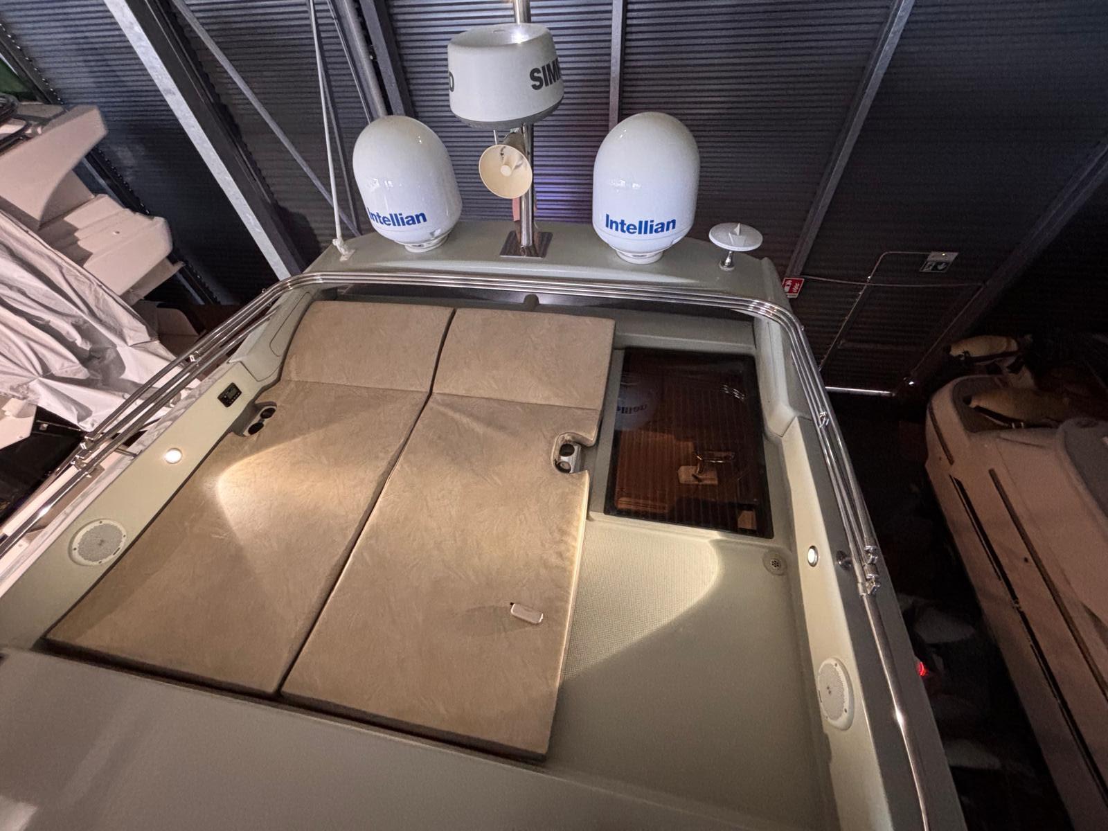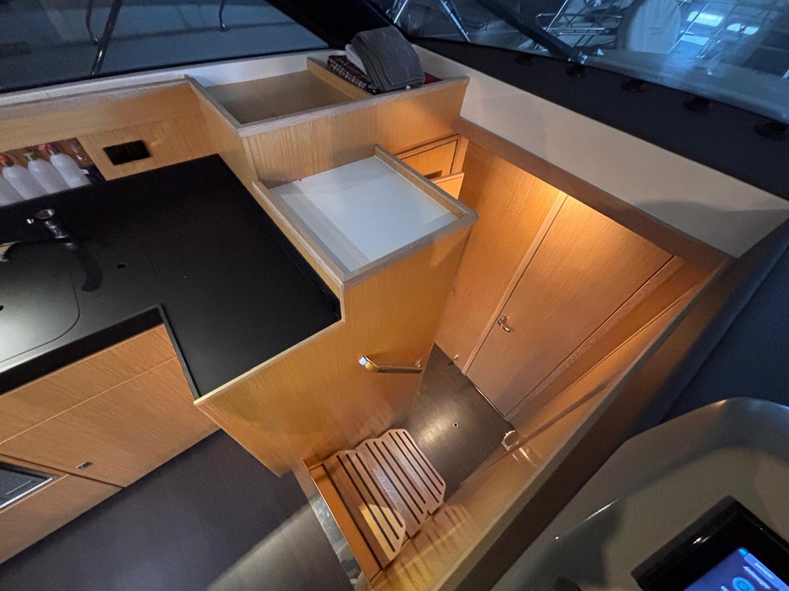 Alarme moteur, Eau sous pression, Douche de cockpit, Flaps électriques, Hard top, Indicateurs de flaps, Éclairage de courtoisie, Spots sous-marins, Passerelle (Idraulica a scomparsa), Plateforme arrière (Idraulica Max 300 kg), Porte latérale, Cockpit en teck (Pozzetto Modulabile in Teak sintetico), Prise de quai, Guindeau électrique, Echelle de bain, Selles pour Annexe, table de cockpit (Modulabile ed espandibile), Table pliante de salon (Incluso Cuscino), Filières avec sortie latèrale, Corne.