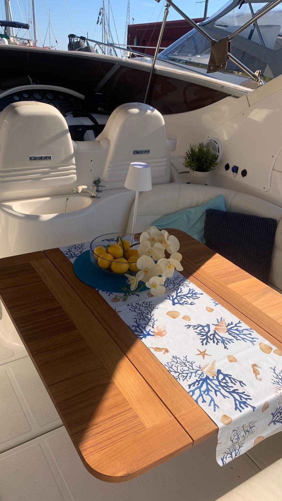 Alarme moteur, Alarme de pompe de cale, Alternateur, Eau sous pression, Douche de cockpit, Flaps hydrauliques, Extincteur(s) fixe(s), Indicateurs de flaps, Lavabo dans le cockpit, Éclairage de courtoisie, Passerelle (Idraulica), Plateforme arrière, Pompe de cale manuelle, Prise de quai, Rollbar, Guindeau électrique, Echelle de bain, table de cockpit, Table pliante de salon, Corne.
