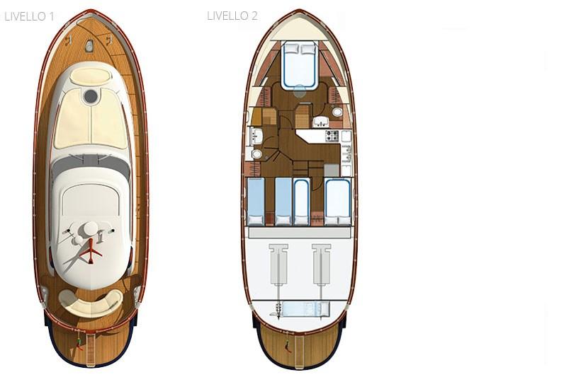 Alarme moteur, Alarme de pompe de cale, Eau sous pression, Passavant en teck, Douche de cockpit, Flaps hydrauliques, Hard top, Indicateurs de flaps, Éclairage de courtoisie, Défenses, Passerelle (IDRAULICA), Plateforme arrière, Pompe de cale manuelle, Pont en teck, Porte latérale, Cockpit en teck, Prise de quai, Onduleur, Guindeau électrique, Echelle de bain, table de cockpit, Table pliante de salon, Annexe, Winch électrique arrière.