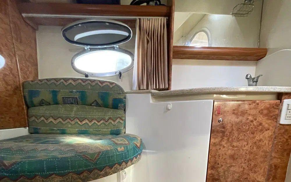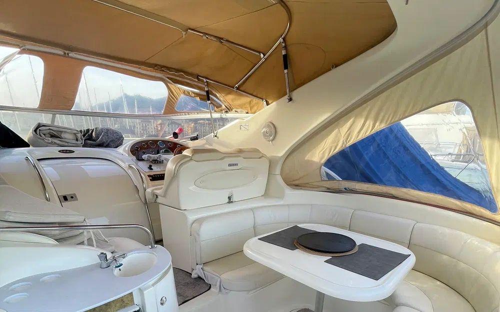 Les équipements extérieurs comprennent des tauds repris récemment, un bimini, une grande bâche d’hivernage, une douchette de pont et un bain de soleil arrière confortable. L’ensemble de la sellerie d’origine est en excellent état, protégée et bien conservée.
