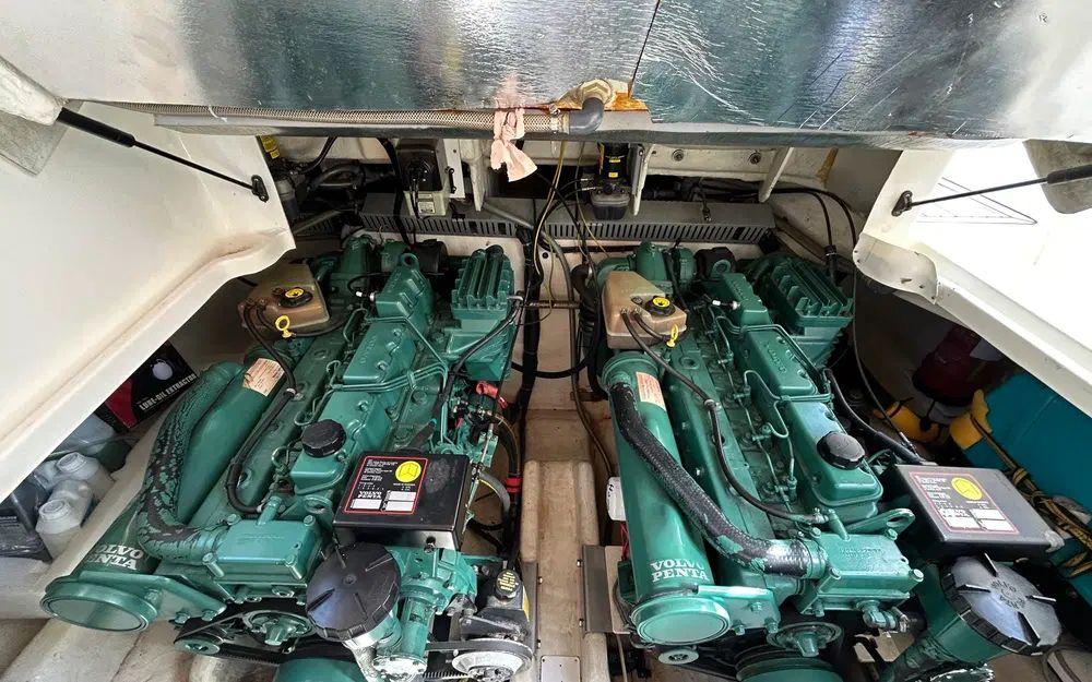 Longueur de 10,90 m, largeur de 3,47 m et tirant d’eau de 0,80 m, ce Gobbi 345 SC est motorisé par deux Volvo Penta diesel de 200 CV chacun. Les moteurs totalisent environ 895 heures, avec un entretien complet incluant vidanges, nettoyage des échangeurs, turbines, turbos remplacés, pompes à eau et révisions régulières.