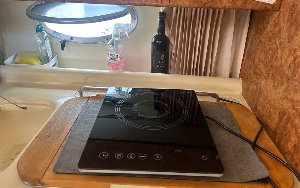 Le bateau dispose d’un carré transformable, d’une cuisine équipée (réfrigérateur intérieur et extérieur, cuisinière Origo), d’une salle d’eau avec WC et douche, ainsi que d’une Smart TV compatible 12V et 220V.