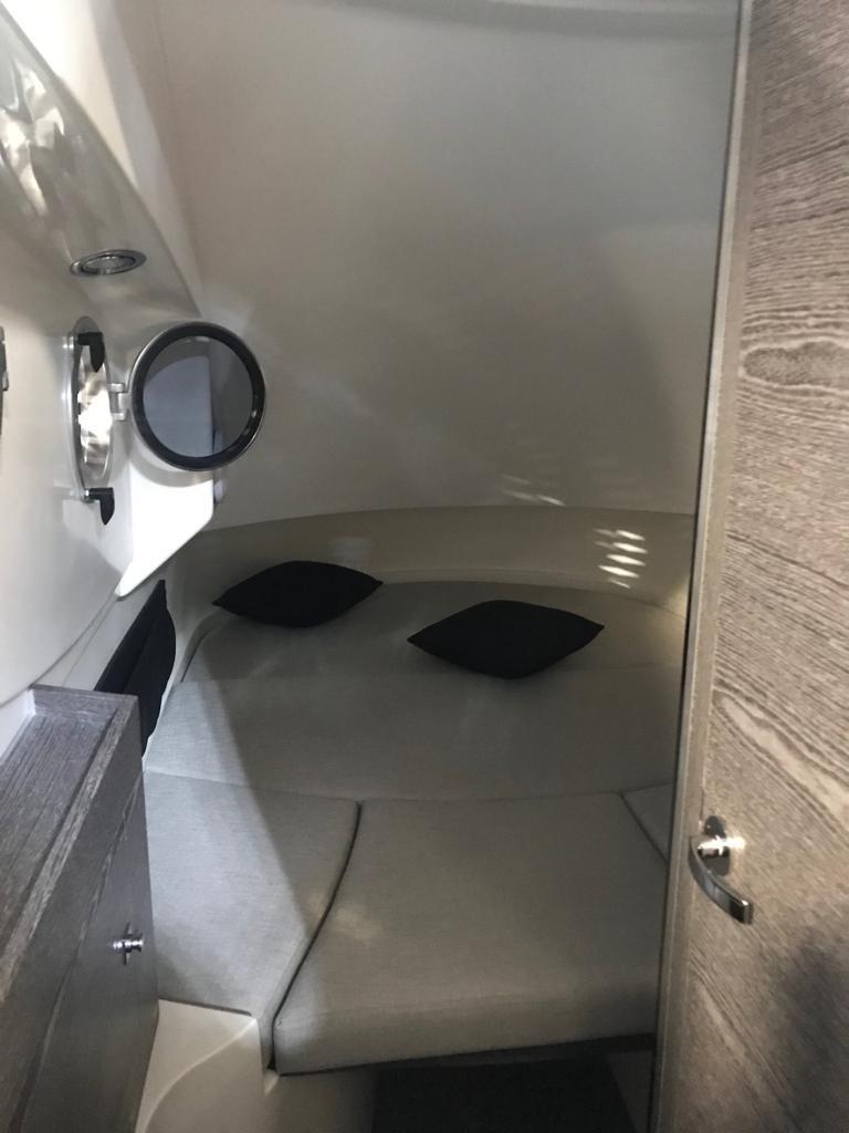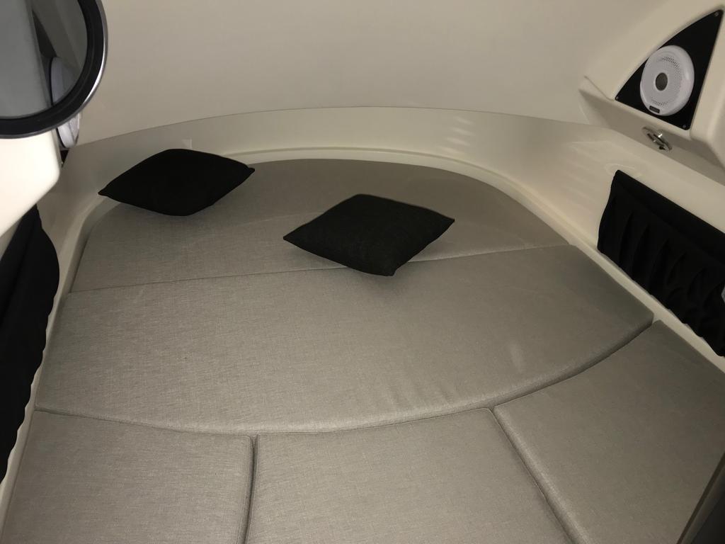 Aménagement complet de cabine de luxe avec salle de bain séparée avec douche et toilettes, mobilier, meubles et coussins