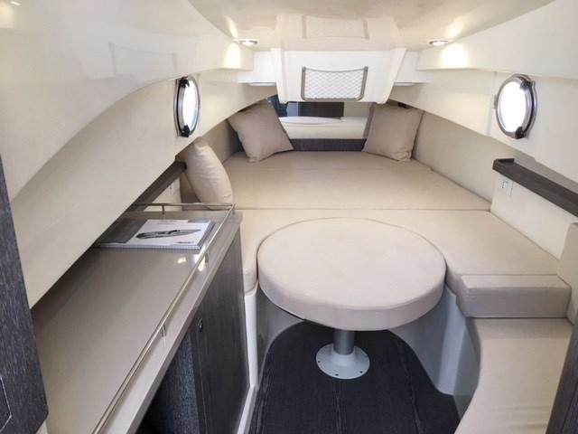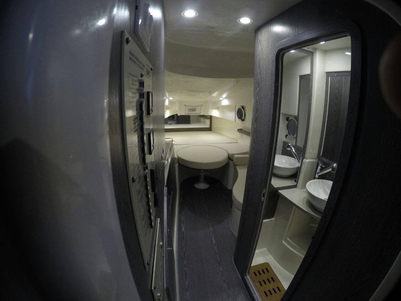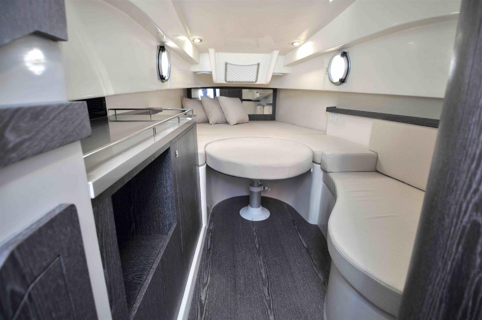 Aménagement complet de cabine de luxe avec salle de bain séparée avec douche et toilettes, mobilier, meubles et coussins