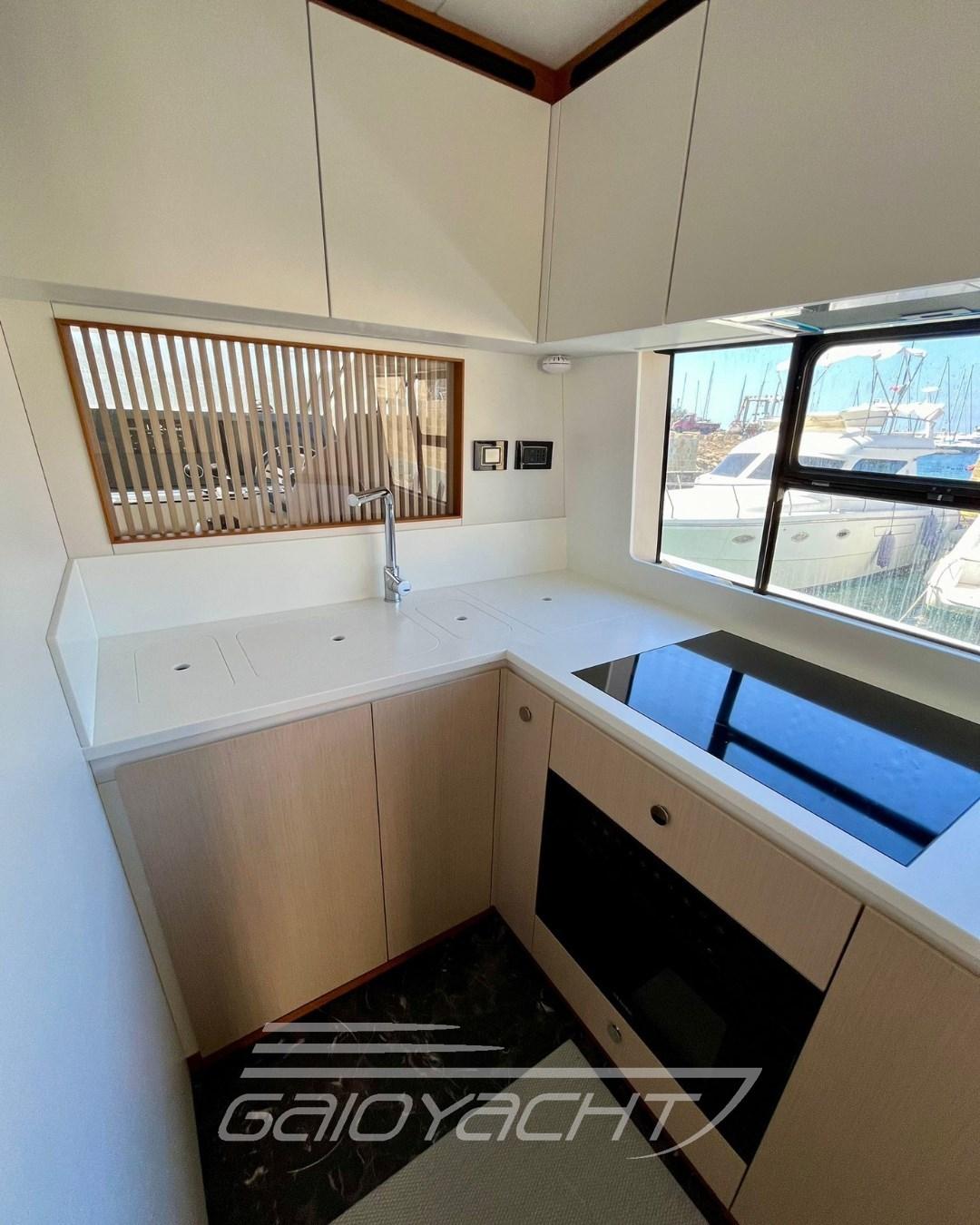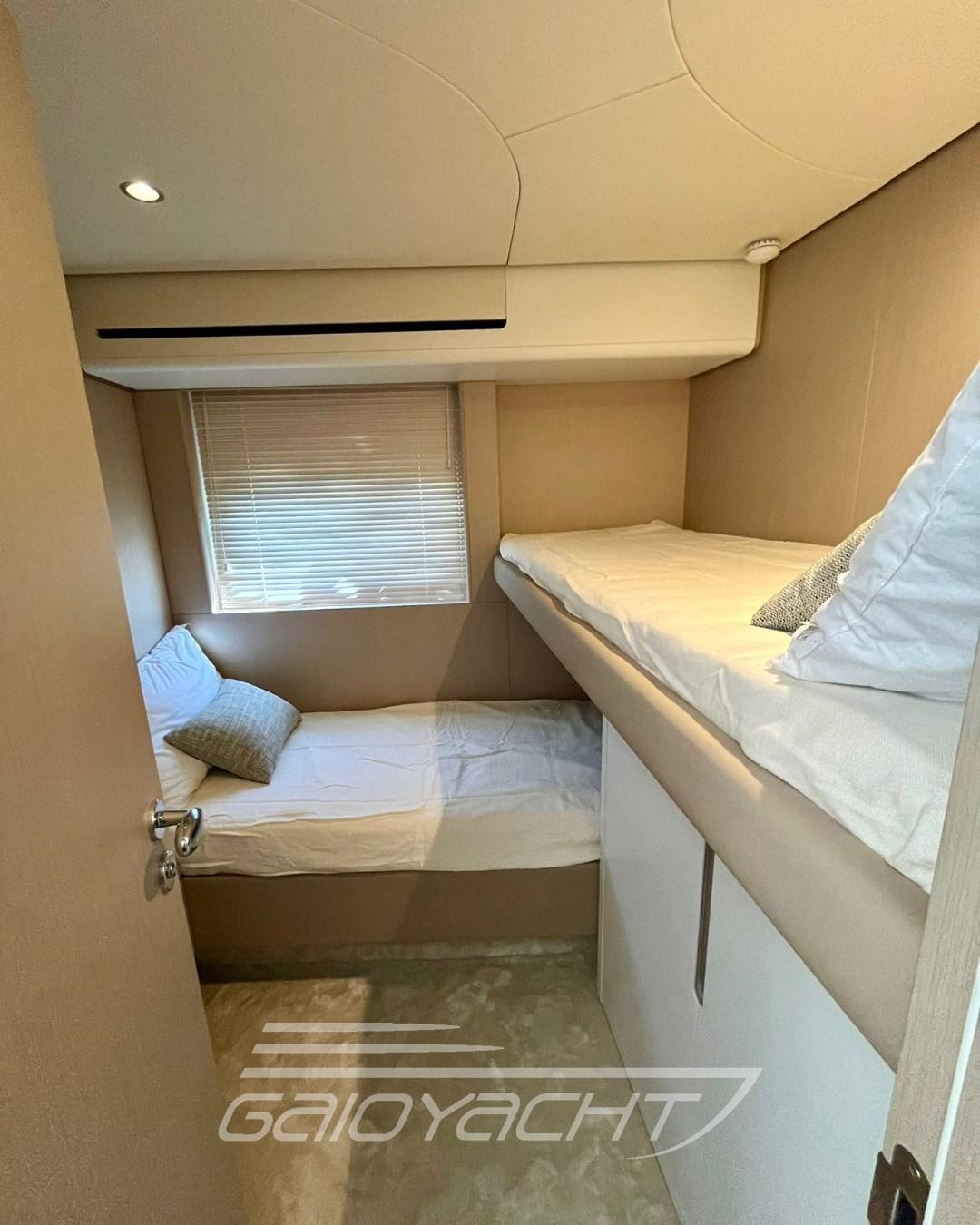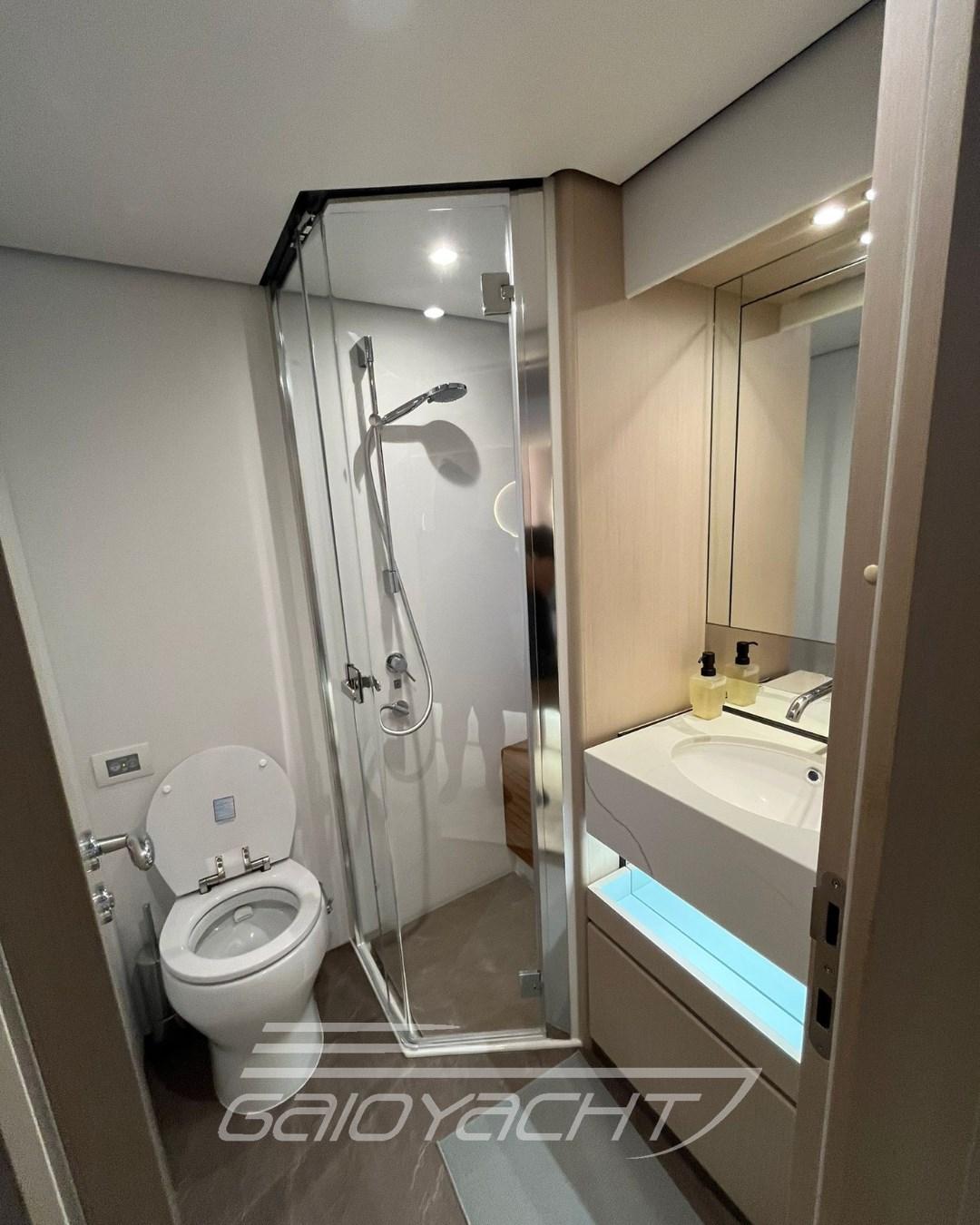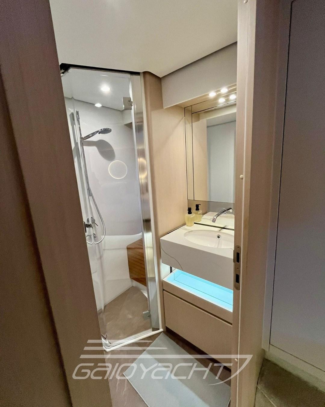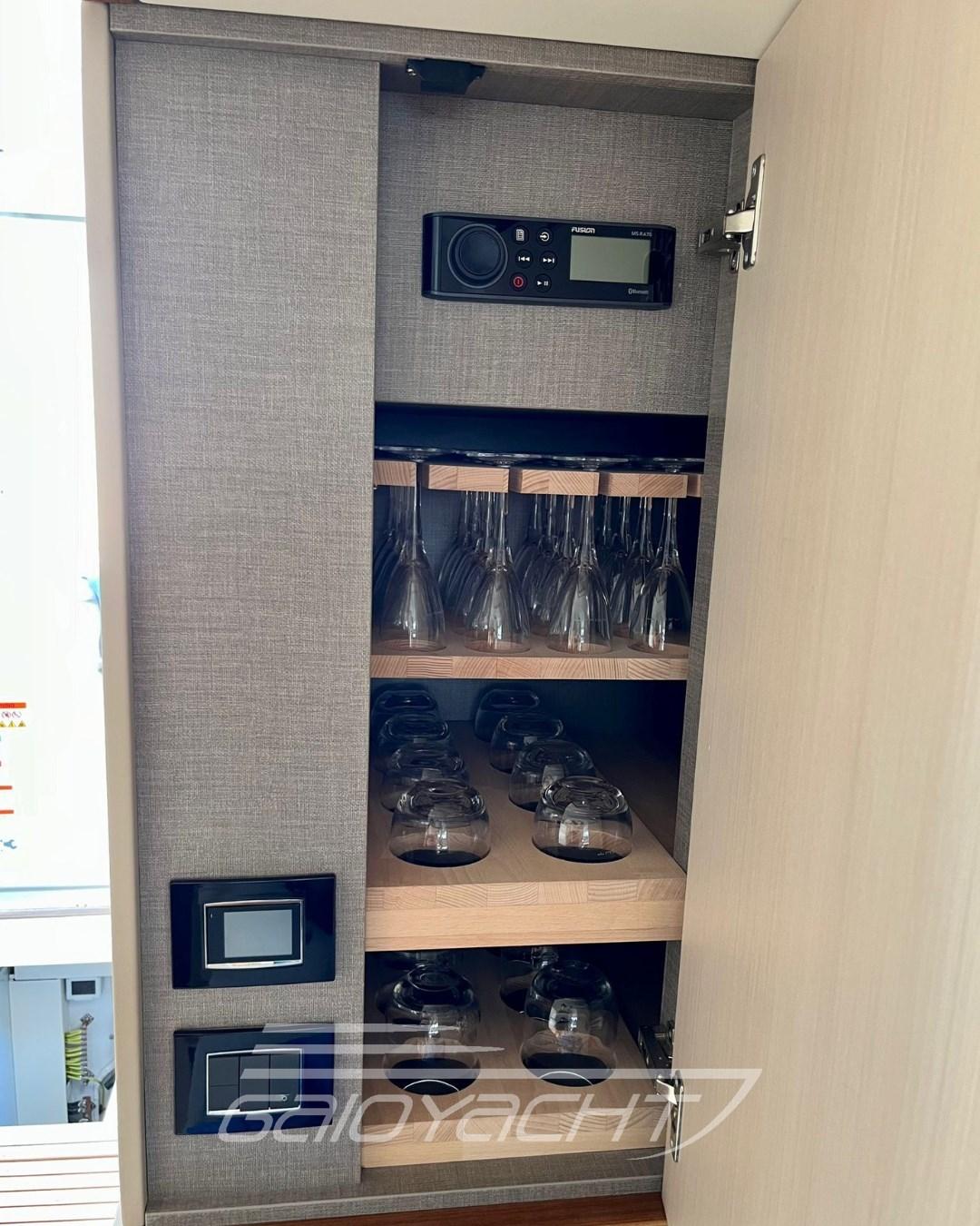 Store enrouleur électrique dans le cockpit ; Table d’étrave supplémentaire en teck ; Dessus de vanité en quartzite dans toutes les salles de bains ; Ensemble Garmin Gold ; système Volvo Interceptor ; Filtre racor pour générateur ; Prédisposition pour le dessalinisateur ; Isolateur galvanique ; Teck à la volée et à l’avant.
