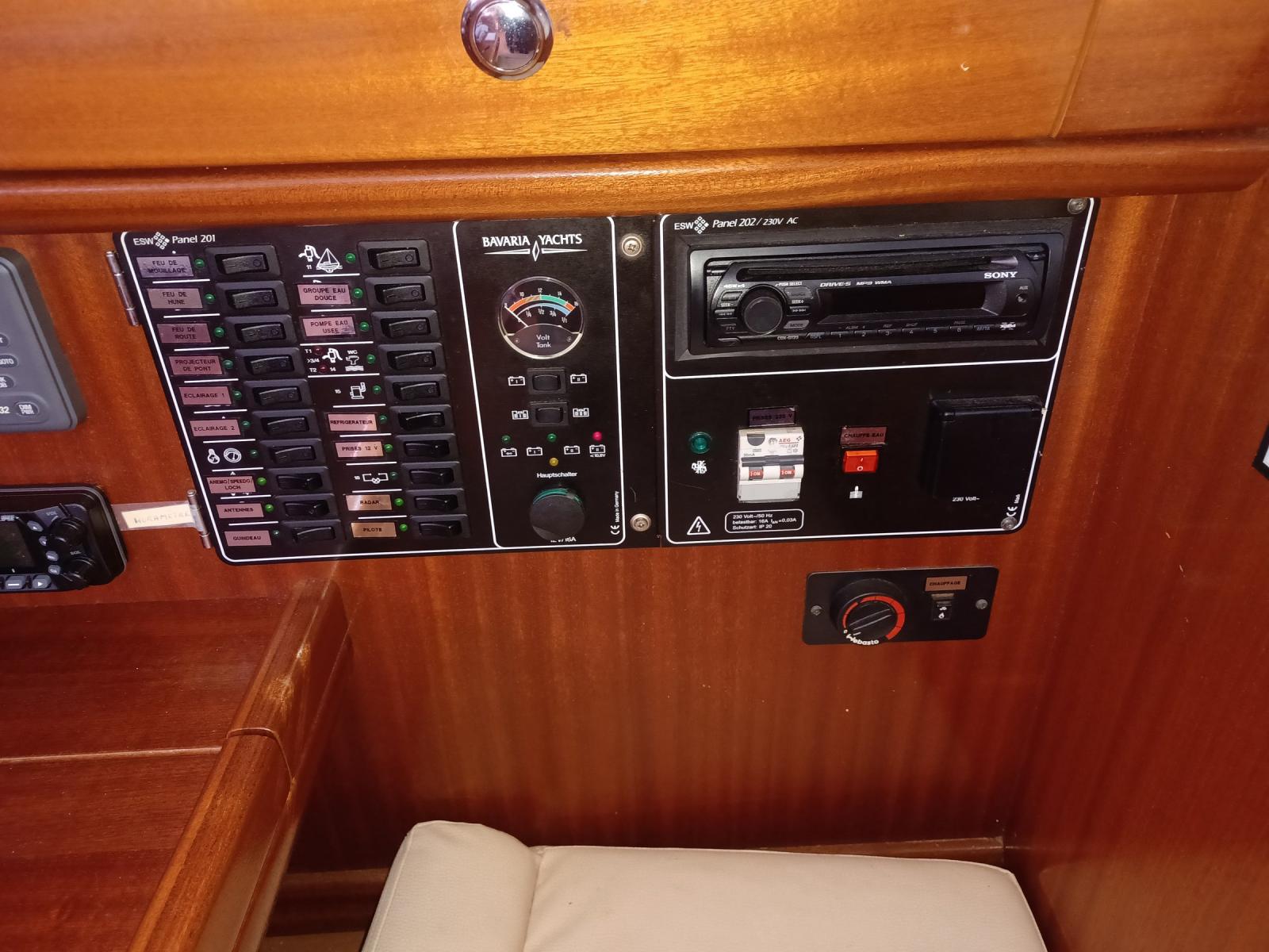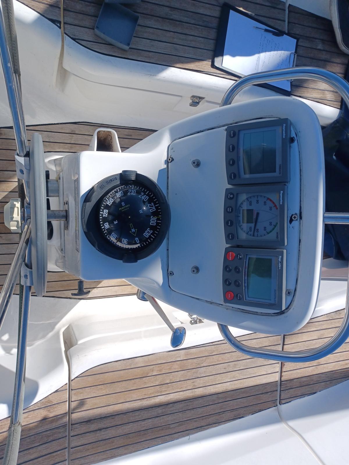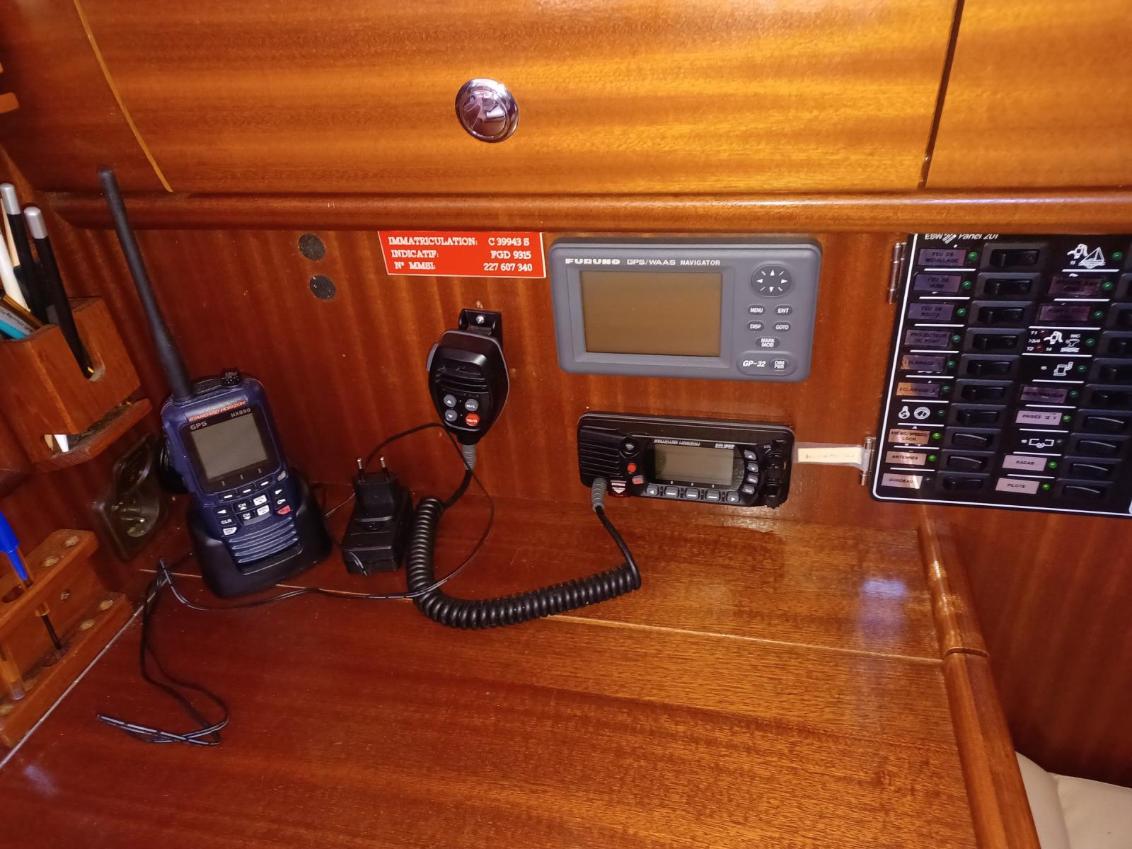 ÉLECTRONIQUE : GPS traceur Axiom 9 Raymarine (carto zone Europe), AIS EM-Track Class B, radar Furuo 1623, pilote auto Raymarine ST4000, Raymarine ST60 : loch/speedo/wind, GPS Furuno GP32, VHF Standard Horizon + 1 VHF portable.