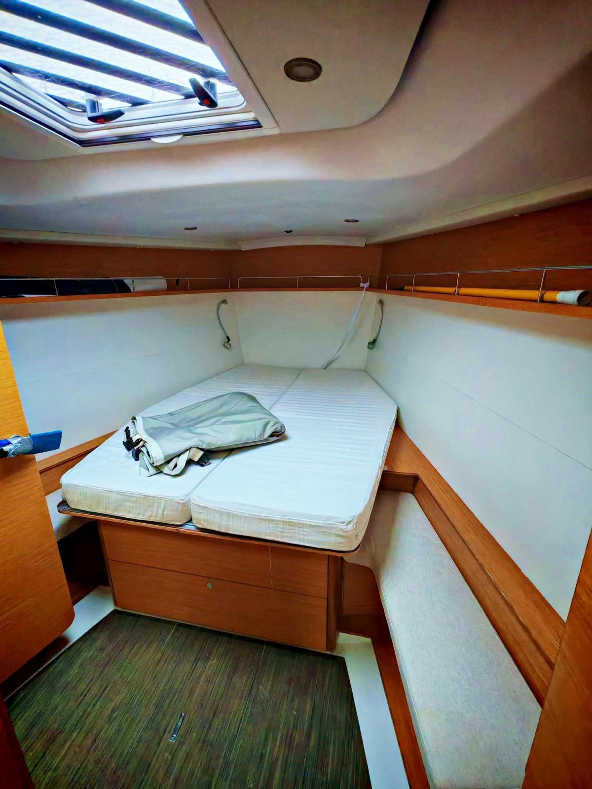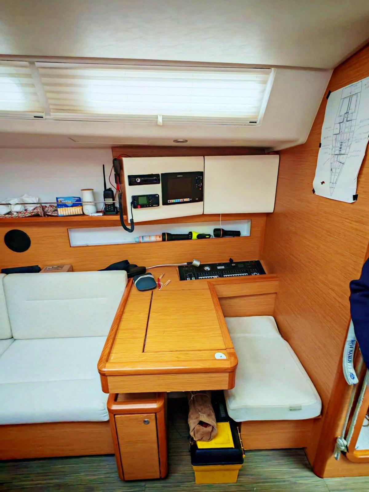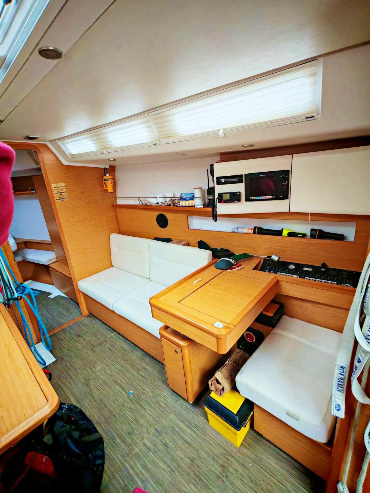 Ancre (Delta), Eau sous pression, 3 Batteries, Douche de cockpit, Double barre à roue, Pompe de cale manuelle, Cockpit en teck, Prise de quai, Répétiteur électronique, Guindeau électrique, Gréement Rod, Echelle de bain, Tuff Luff, 5 Winch, Windex.
