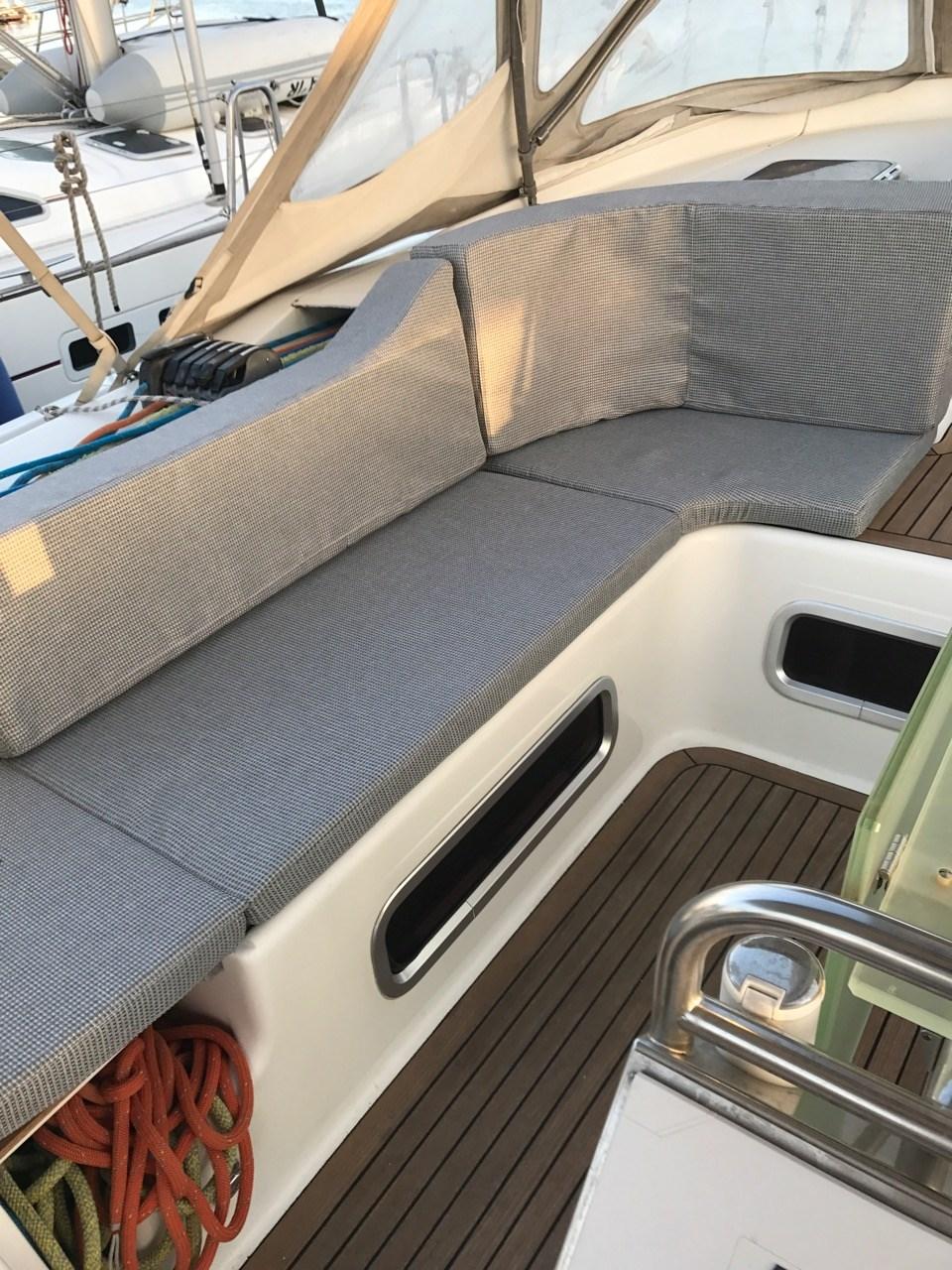 Alarme moteur, Eau sous pression, Douche de cockpit, Plateforme arrière, Pompe de cale manuelle, Cockpit en teck, Onduleur, Guindeau électrique.