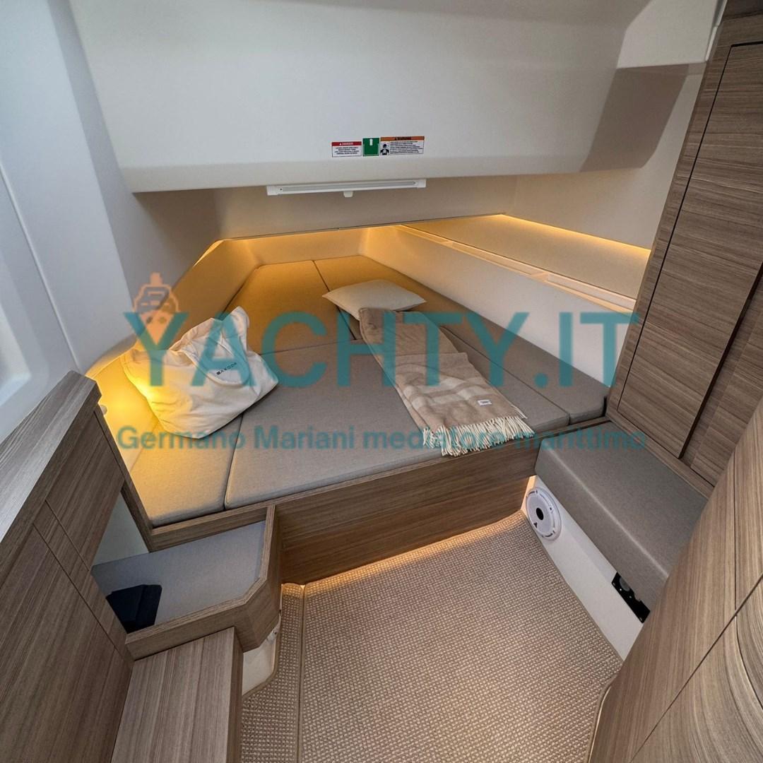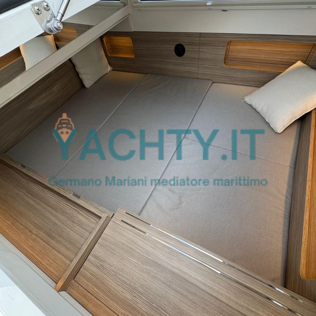 Le confort est assuré par des équipements haut de gamme tels que le propulseur à proue, le trim automatique Lenco Pro, un système d’ancrage rétractable avec Ultra Anchor, le système d’alimentation à quai Mastervolt, l’eau chaude, des toilettes électriques et une cuisine fonctionnelle avec réfrigérateur extérieur. Les coussins couleur miel complètent un environnement élégant et accueillant.