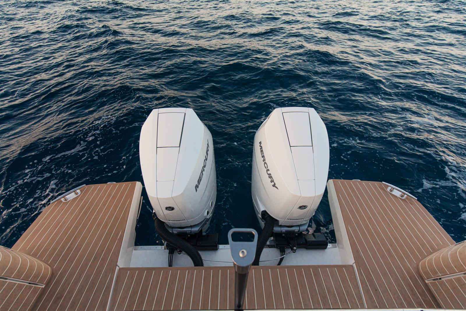 Propulsé par 2 moteurs Mercury V10 350 ch Black, il garantit une accélération rapide et une maniabilité précise, soutenu par la dernière génération d’instruments avec un écran Simrad NSS4 de 16", GPS, sondeuse d’écho et VHF. Le cockpit est un véritable salon sur l’eau, sublimé par un cockpit en teck, des tables pliantes (salon avec pied électrique), des lumières de courtoisie ainsi que des lumières sous-marines qui transforment l’amarrage du soir en un moment pittoresque.