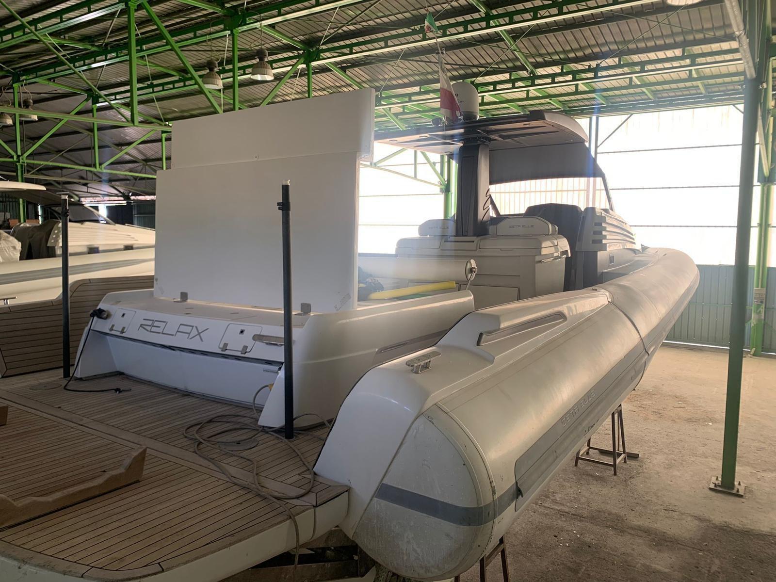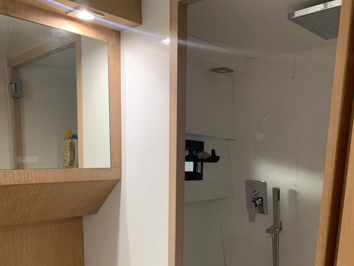 L’un des éléments remarquables est l’aile en fibre de verre à la poupe qui s’ouvre hydrauliquement sur l’eau, augmentant la surface du plancher et réduisant le roulis à l’ancre. La conception de la coque et la proue « perforante des vagues » assurent un grand confort même en mer agitée, maintenant une flottabilité constante sans cabrata.