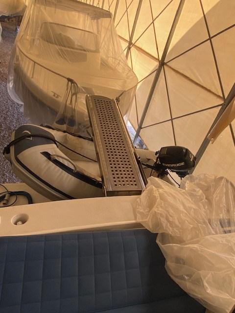 Bateau pneumatique Lomac de 2,45 m avec Evinrude 9,8 ch hors-bord - passerelle électrohydraulique - plateforme arrière avec échelle de natation - douche chaude/froide à l’arrière - chaudière - prise d’alimentation à quai - chargeur de batterie SBC - placard de cuisson à deux brûleurs au gaz - réfrigérateur - système audio.