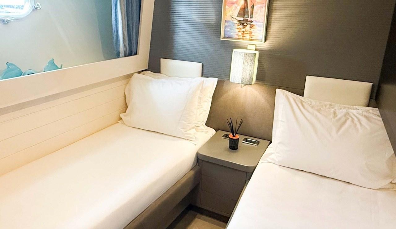 Cabine principale avec lit double, dressing et salle de bain (entrée de la cabine indépendante du carré) - Cabine VIP avec lit double et salle de bain - cabine invités avec deux lits plats, troisième lit escamotable et salle de bain - cabine invités avec deux lits plats, troisième lit escamotable et salle de bain.